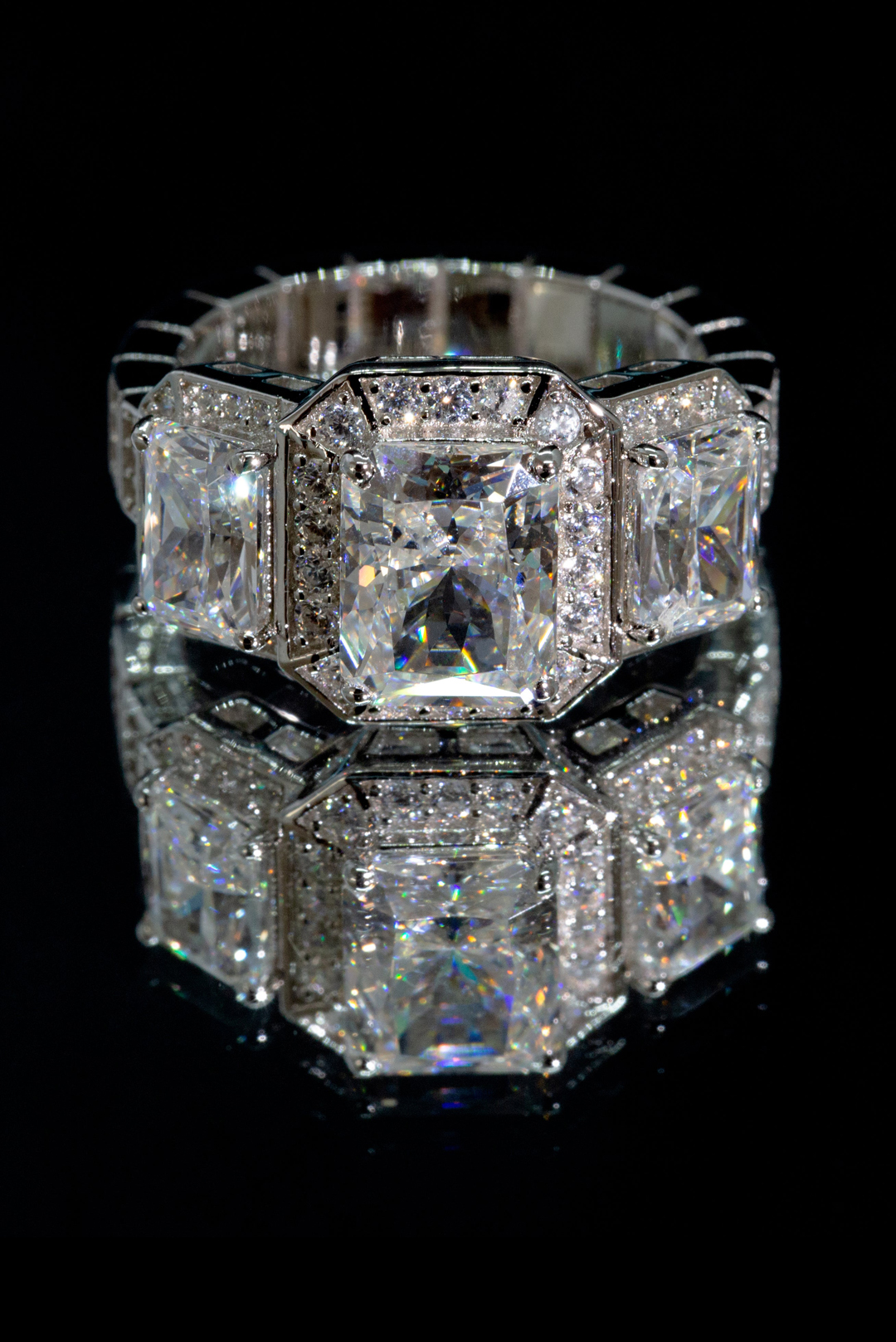 Emerald άχρωμος μοϊσανίτης διακοσμημένος σε pave σχέδιο με μικρότερους μοϊσανιτες στα πλαϊνά δεμένο σε σκελετό από ασήμι 925. GM: 7,33 Καράτια Βάρος: 3.00