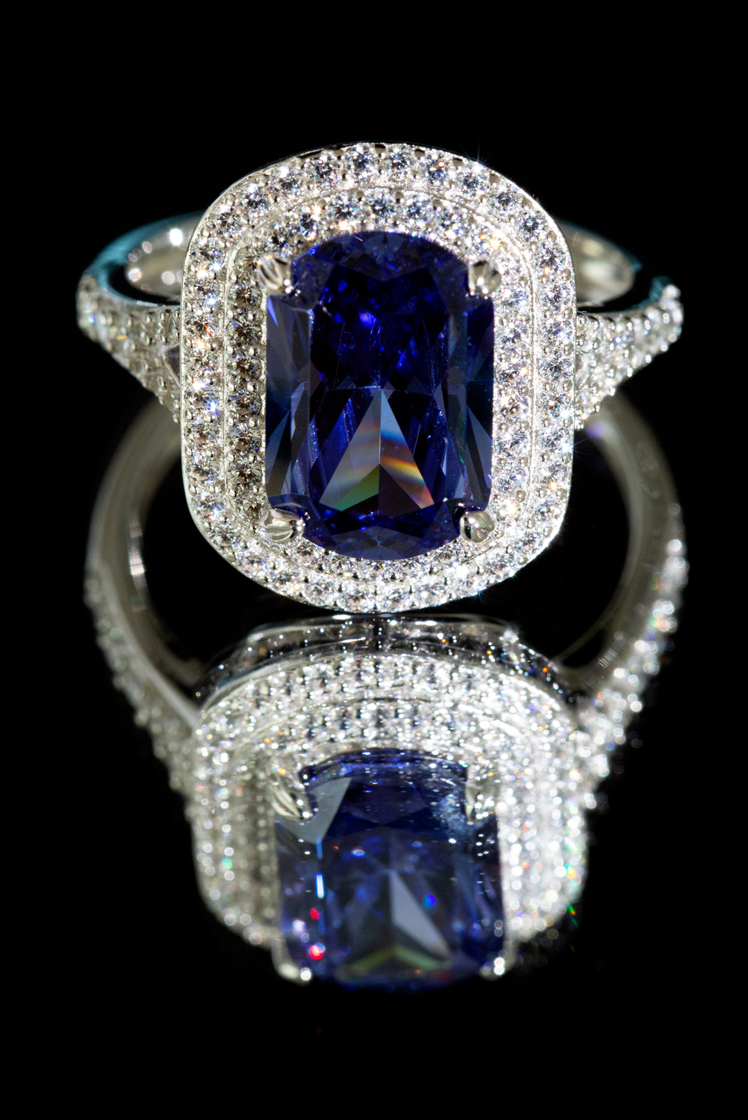 Radiant μοϊσανίτης σε βαθύ μπλέ  διακοσμημένος σε pave σχέδιο με μικρότερους μοϊσανιτες στα πλαϊνά δεμένο σε σκελετό από ασήμι 925. GM: 4,90 Καράτια Βάρος: 3.00
