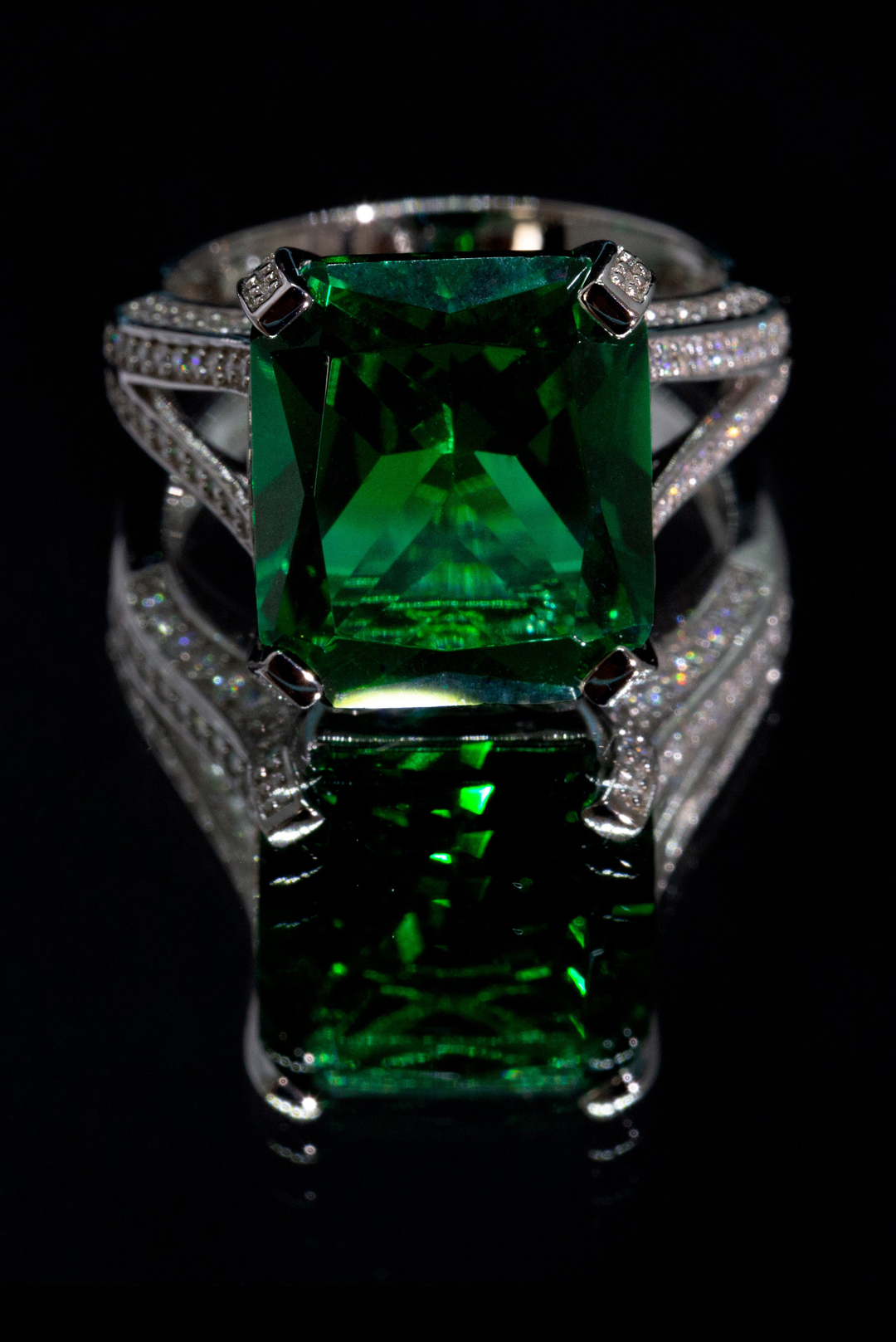 Cushion μοϊσανίτης σε βαθύ σμαραγδί απόχρωση  διακοσμημένος σε pave σχέδιο με μικρότερους μοϊσανιτες στα πλαϊνά δεμένο σε σκελετό από ασήμι 925. GM: 6,00 καράτια Βάρος: 2.00