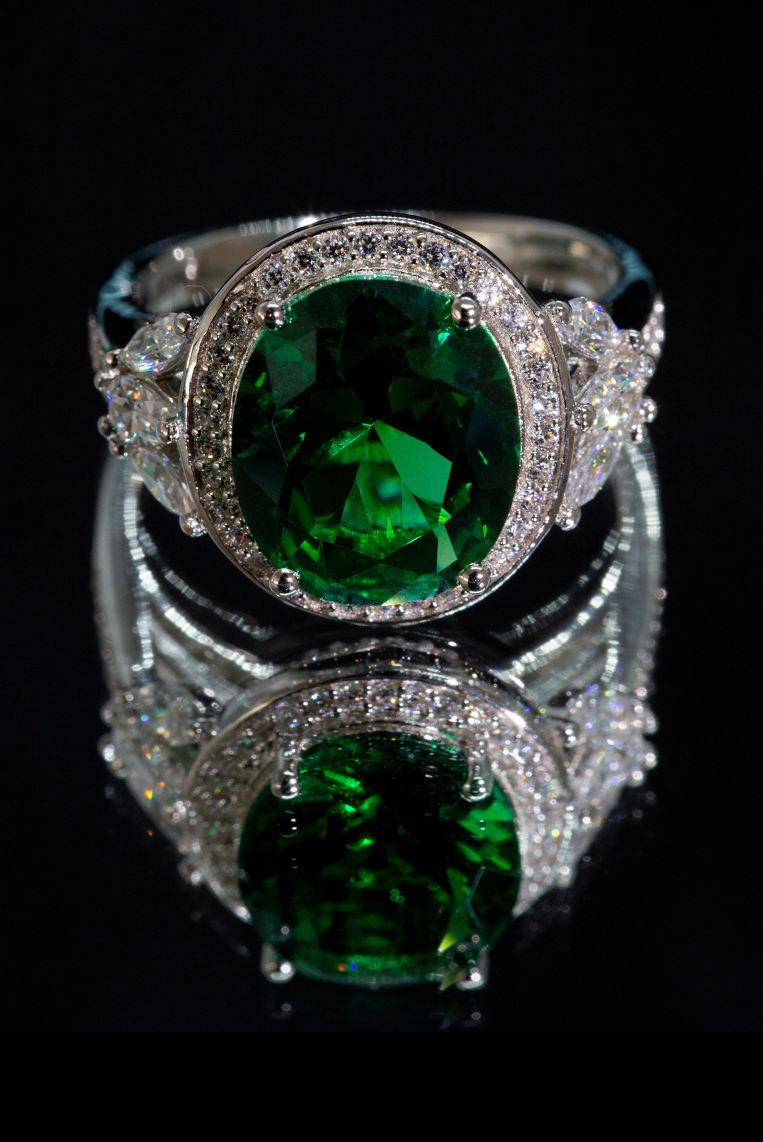Oval μοϊσανίτης σε βαθύ σμαραγδί απόχρωση  διακοσμημένος σε pave σχέδιο με μικρότερους μοϊσανιτες στα πλαϊνά δεμένο σε σκελετό από ασήμι 925. GM: 4,80 Καράτια Βάρος: 3,00