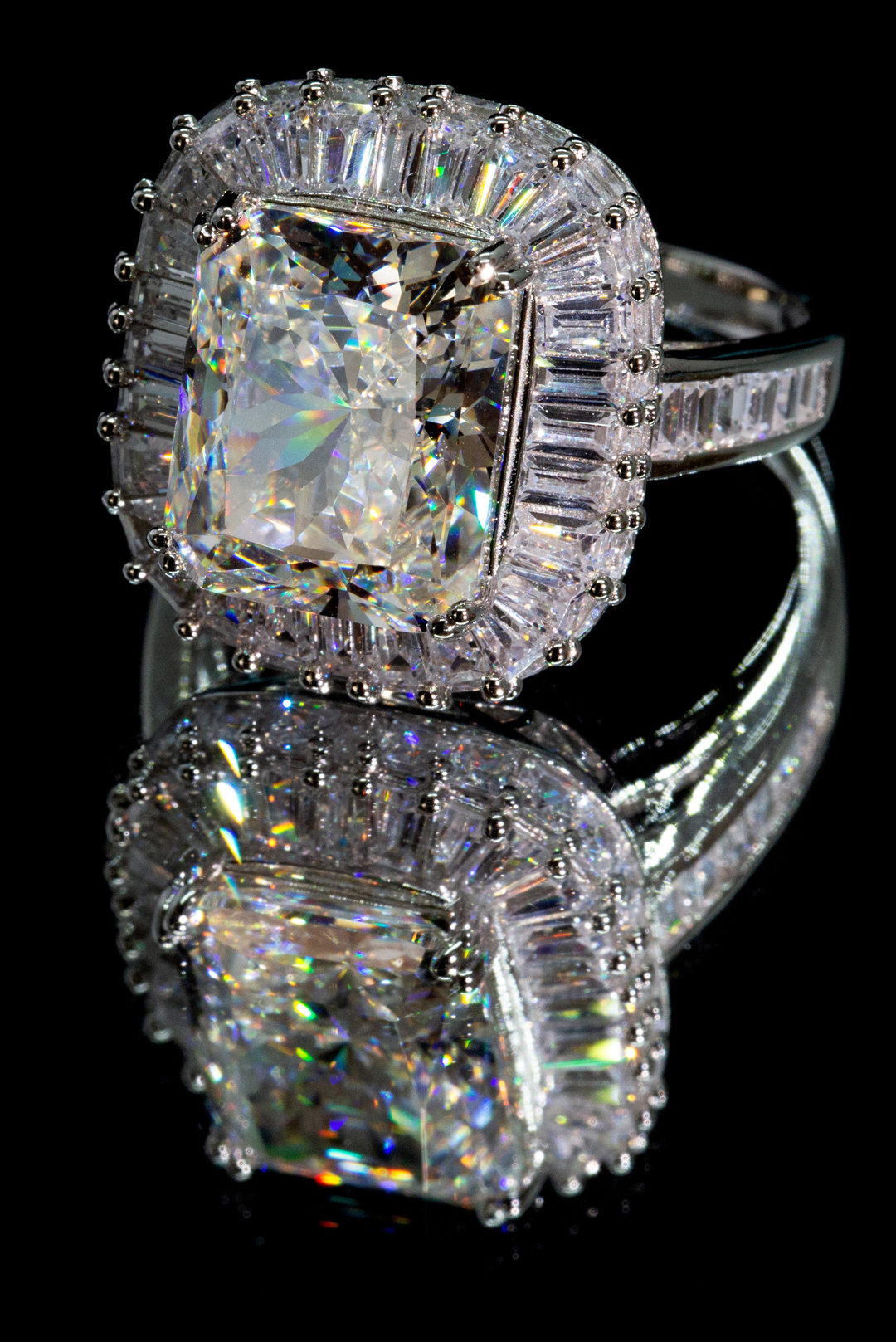 Radiant άχρωμος μοϊσανίτης διακοσμημένος σε pave σχέδιο με μικρότερους μοϊσανιτες στα πλαϊνά δεμένο σε σκελετό από ασήμι 925. GM: 8,55 Καράτια Βάρος: 4.00