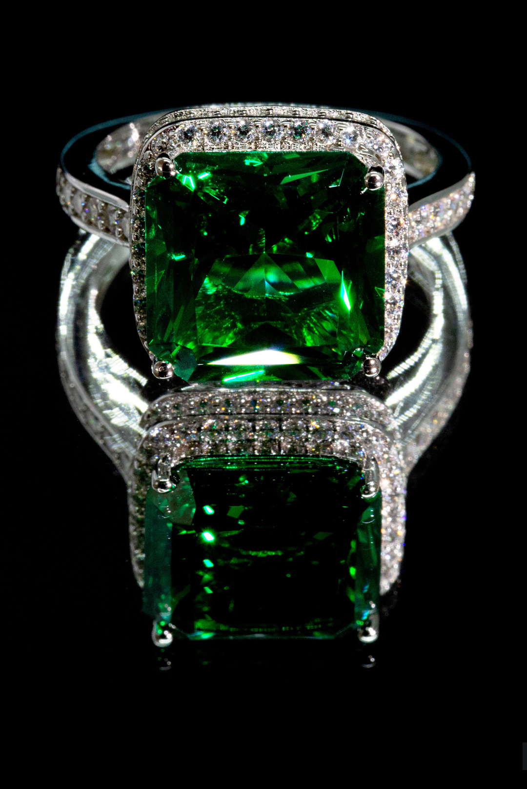 Square μοϊσανίτης σε βαθύ σμαραγδί απόχρωση  διακοσμημένος σε pave σχέδιο με μικρότερους μοϊσανιτες στα πλαϊνά δεμένο σε σκελετό από ασήμι 925. GM: 5,40 Καράτια Βάρος: 2.00