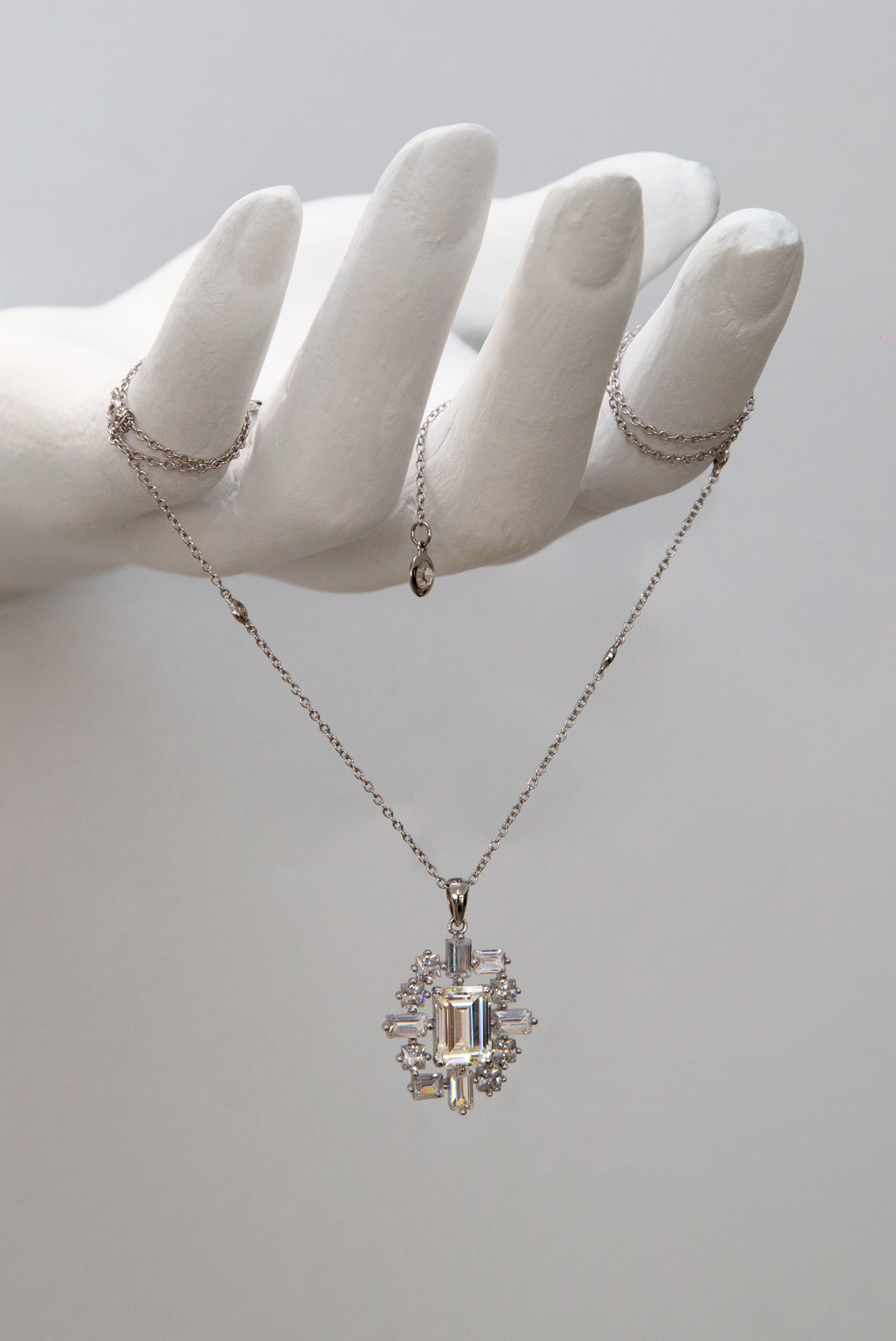 Radiant άχρωμο κολιέ μοϊσανίτη διακοσμημένο σε pave σχέδιο με μικρότερους μοϊσανιτες στα πλαϊνά δεμένο σε σκελετό από ασήμι 925. GM: 6,50 Καράτια Βάρος: 3,50