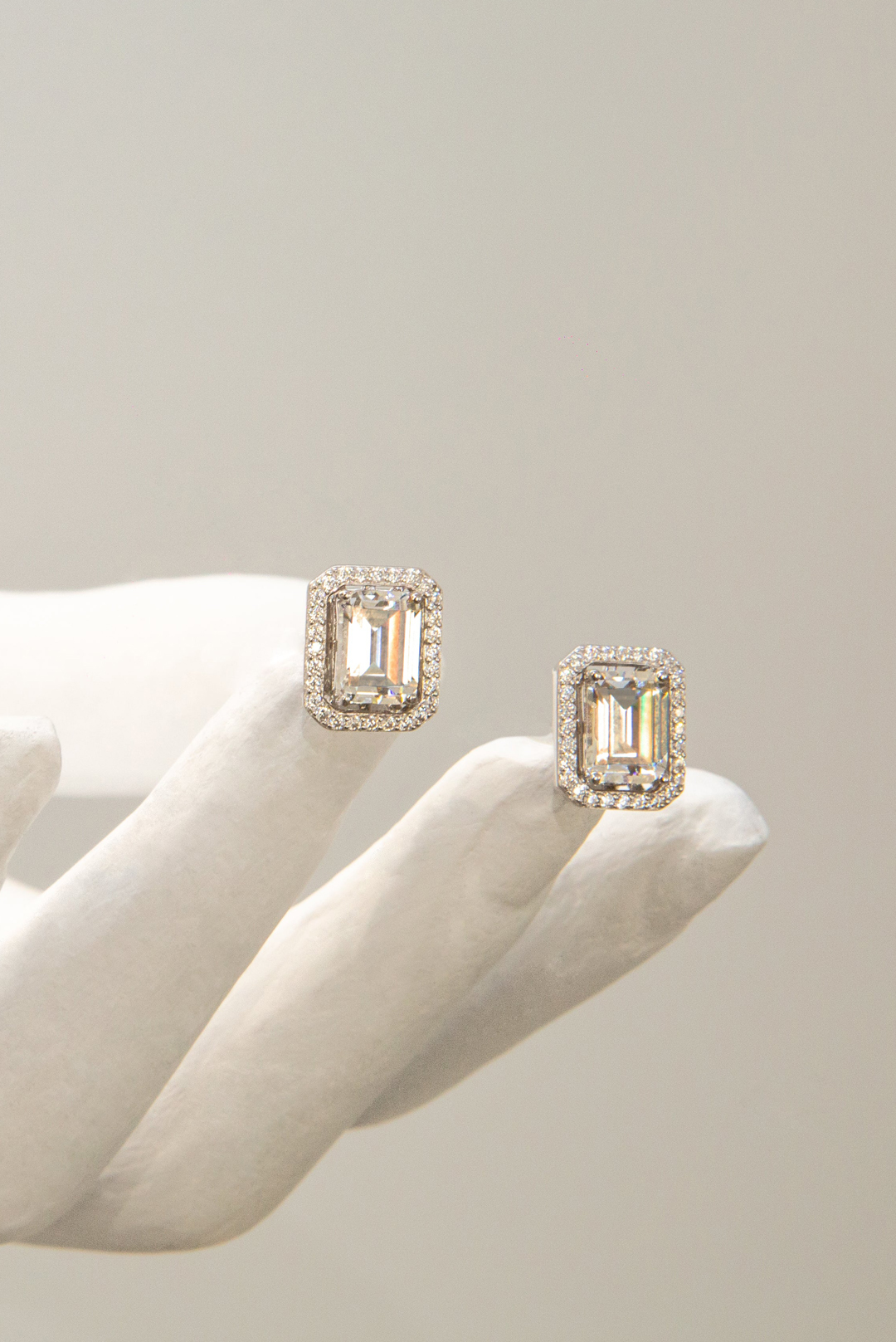 Radiant άχρωμα σκουλαρίκια μοϊσανίτη διακοσμημένα σε pave σχεδιο με μικρότερους μοϊσανίτες στα πλαϊνά δεμένα σε σκελετό από ασήμι 925. GM: 4,27 Καράτια Βάρος: 2,00