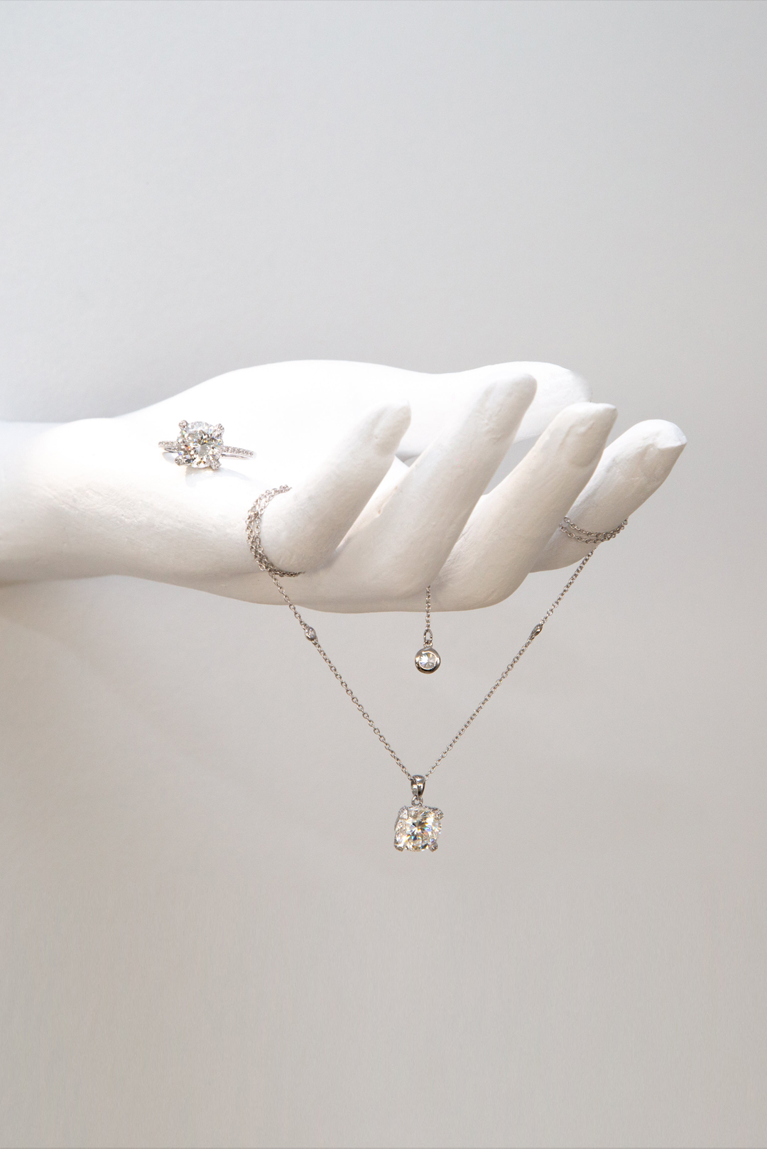 Radiant άχρωμος μοϊσανίτης  διακοσμημένος σε pave σχέδιο με μικρότερους μοϊσανιτες στα πλαϊνά δεμένο σε σκελετό από ασήμι 925. GM: 7,70 Καράτια Βάρος: 3.50
