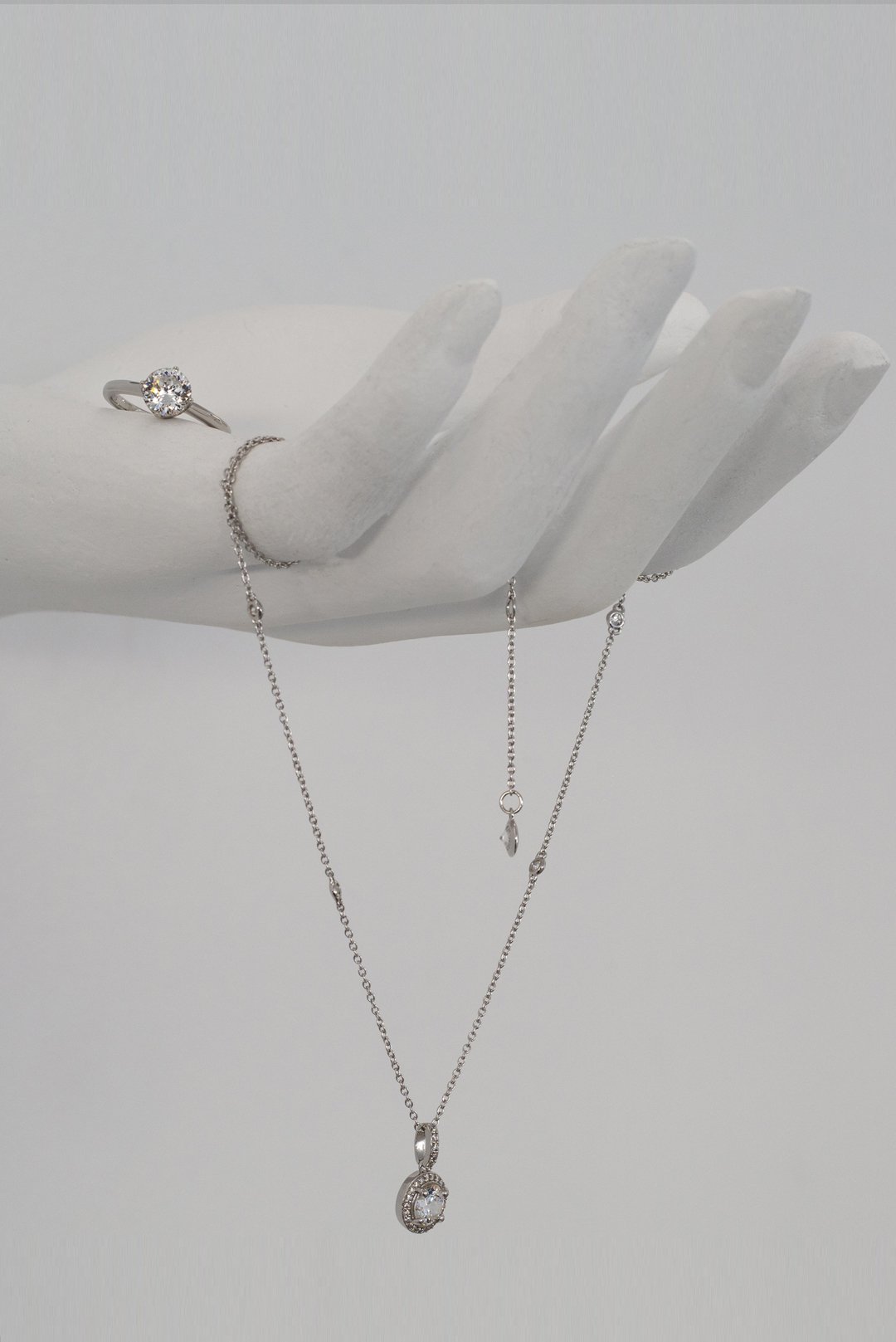 Round brilliant άχρωμος μοϊσανίτης διακοσμημένος σε pave σχέδιο με μικρότερους μοϊσανιτες στα πλαϊνά δεμένο σε σκελετό από ασήμι 925. GM: 6,06 Καράτια Βάρος: 6.00