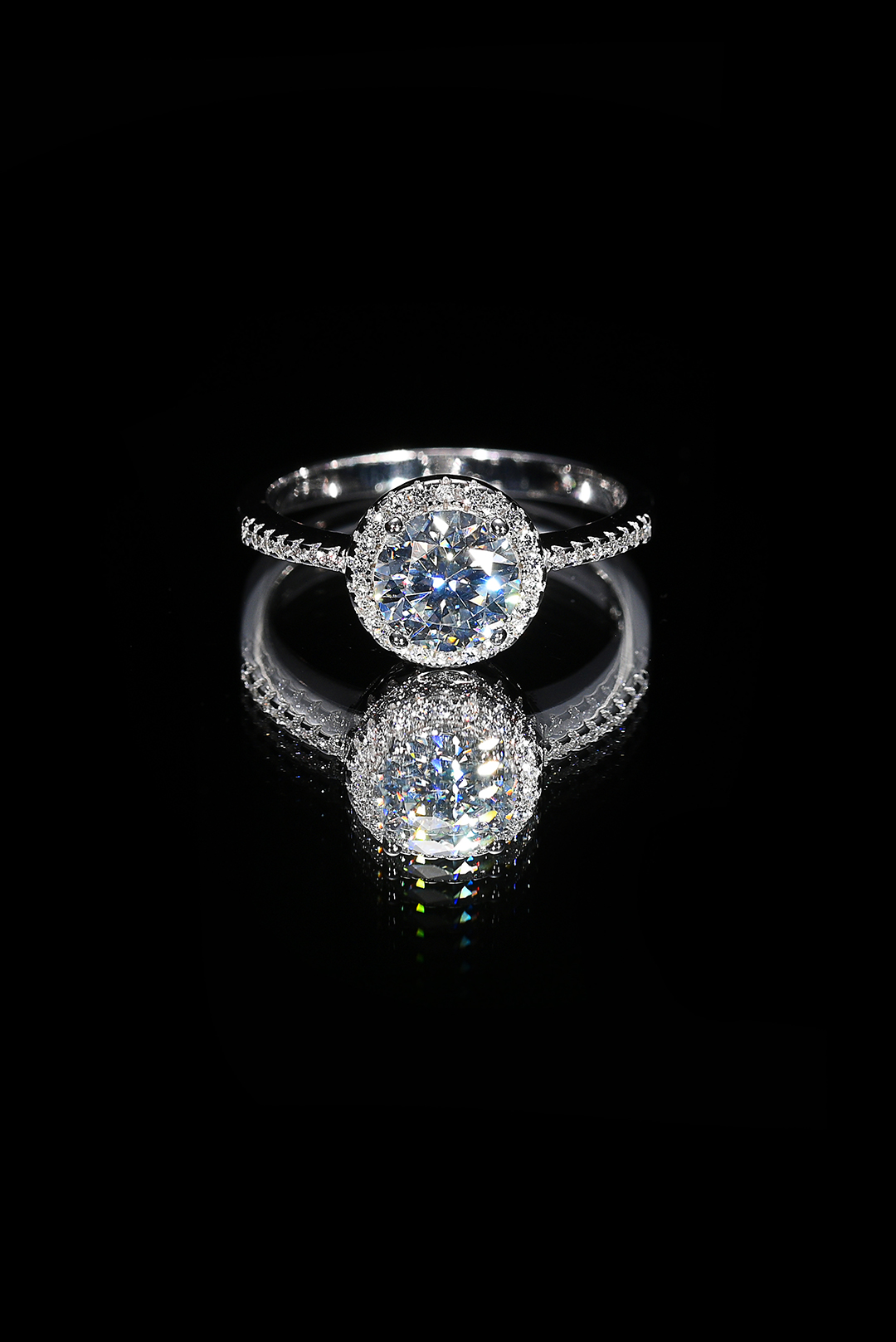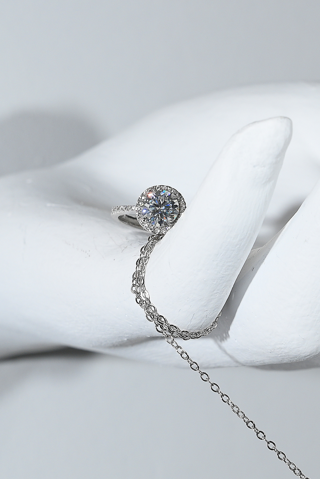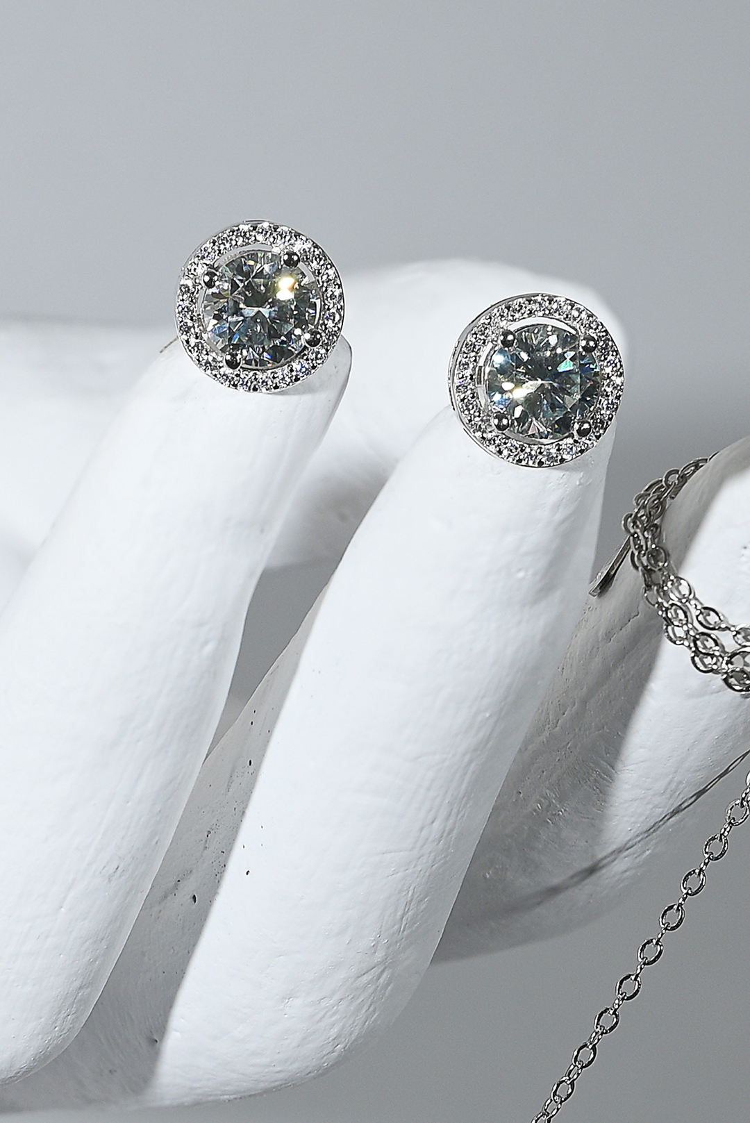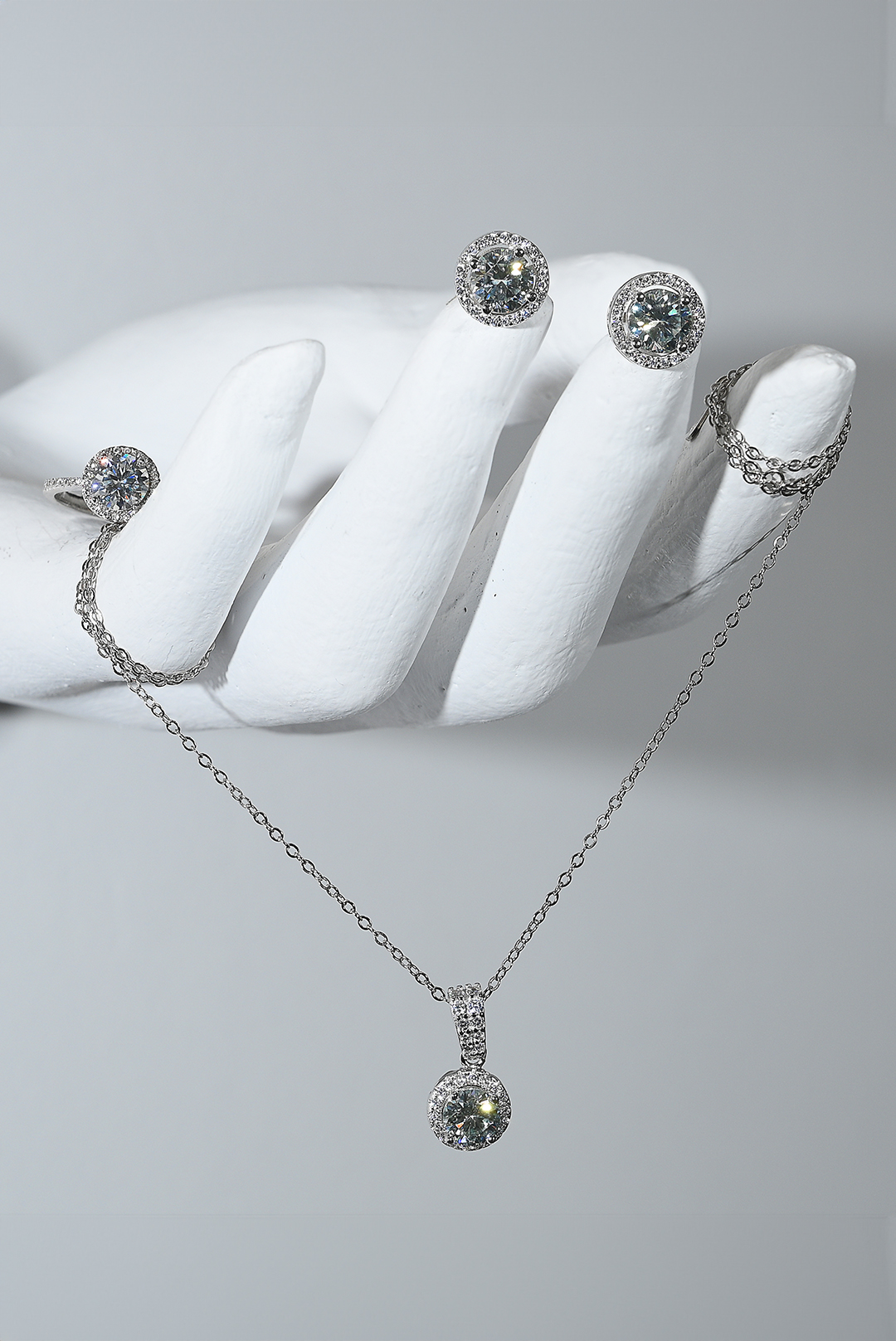Set round άχρωμου μοϊσανίτης δεμένο σε σκελετό από ασήμι 925. Δαχτυλίδι, σκουλαρίκια και κολιέ GM: 8.14 Καράτια Βάρος: 4.00