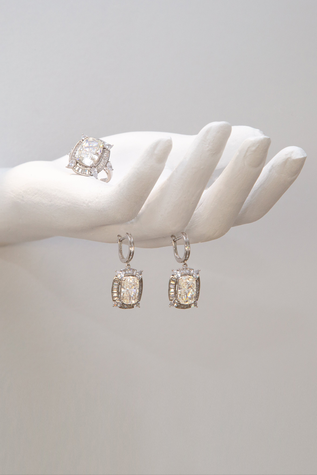 Radiant άχρωμος μοϊσανίτης  διακοσμημένος σε pave σχέδιο με μικρότερους μοϊσανιτες στα πλαϊνά δεμένο σε σκελετό από ασήμι 925. GM: 17,05 Καράτια Βάρος: 5.00