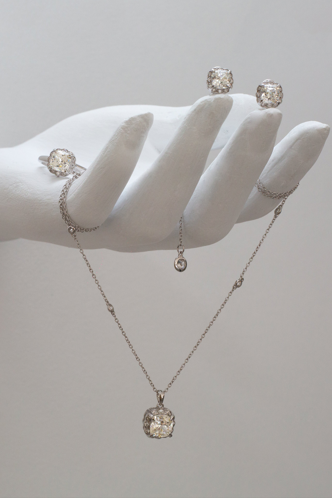 Square άχρωμος μοϊσανίτης διακοσμημένος σε pave σχέδιο με μικρότερους μοϊσανιτες στα πλαϊνά δεμένο σε σκελετό από ασήμι 925. GM: 9,97 Καράτια Βάρος: 4.00