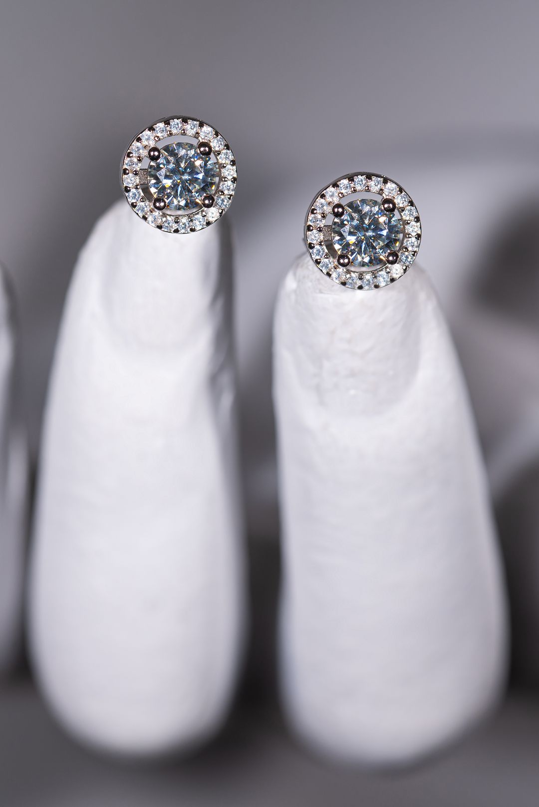 Round brilliant άχρωμα σκουλαρίκια μοϊσανίτη δεμένα σε σκελετό από ασήμι 925. GM: 1.56 και 2.35 Καράτια Βάρος: 1,00 και 2.00 αντιστοίχος GRA Certified