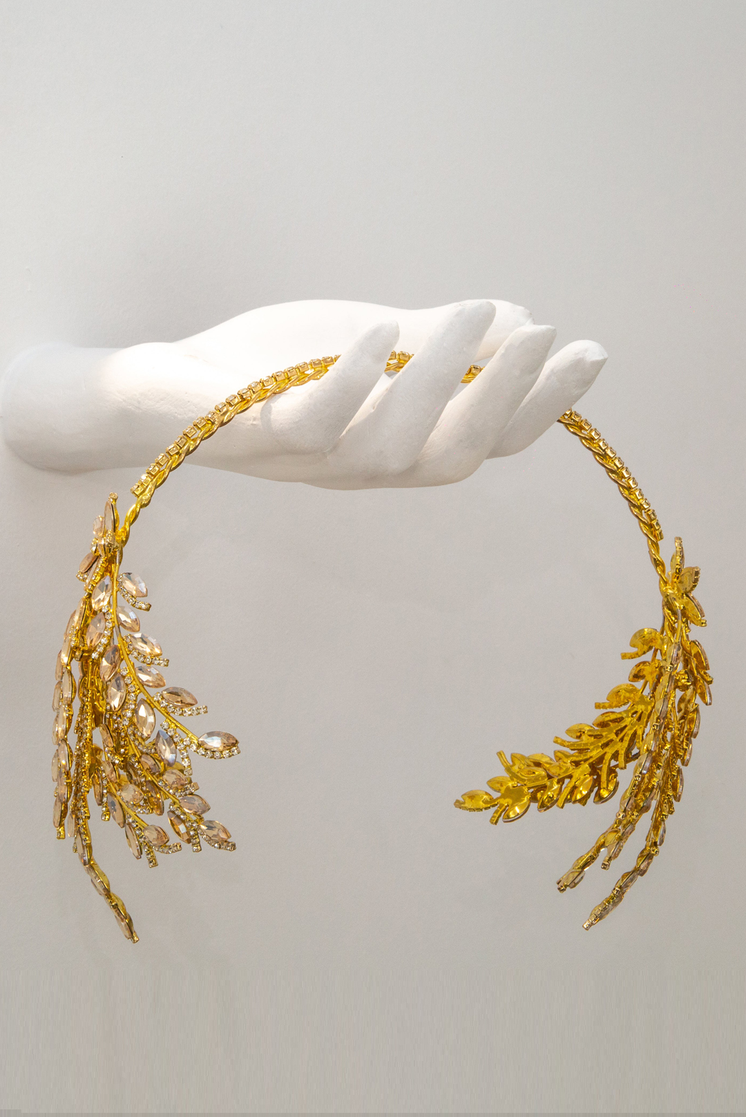 Χειροποίητη τιάρα μεσαίου μεγέθους σε στυλ στεφανιού με διάφανα κρύσταλλα επιχρυσωμένα.