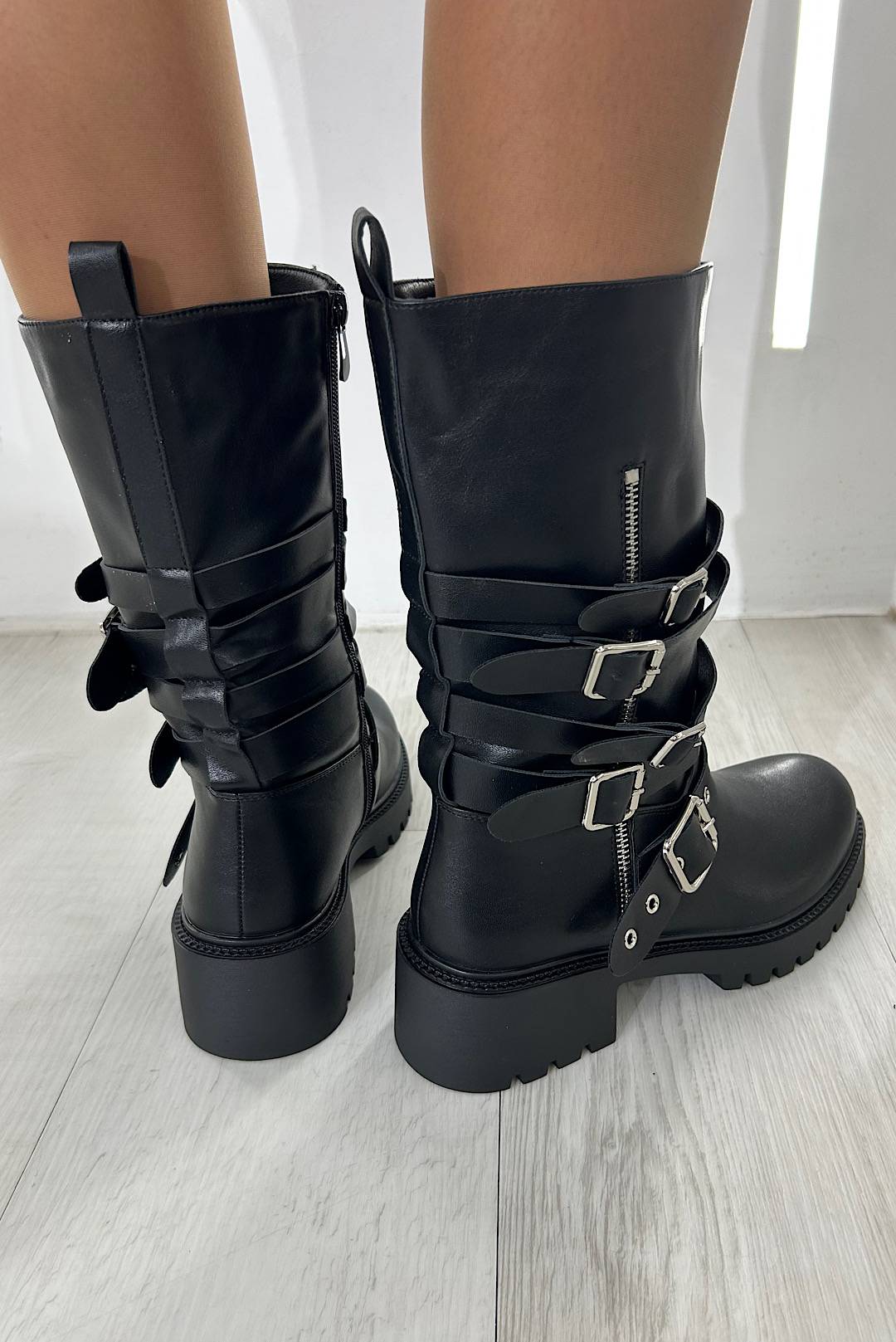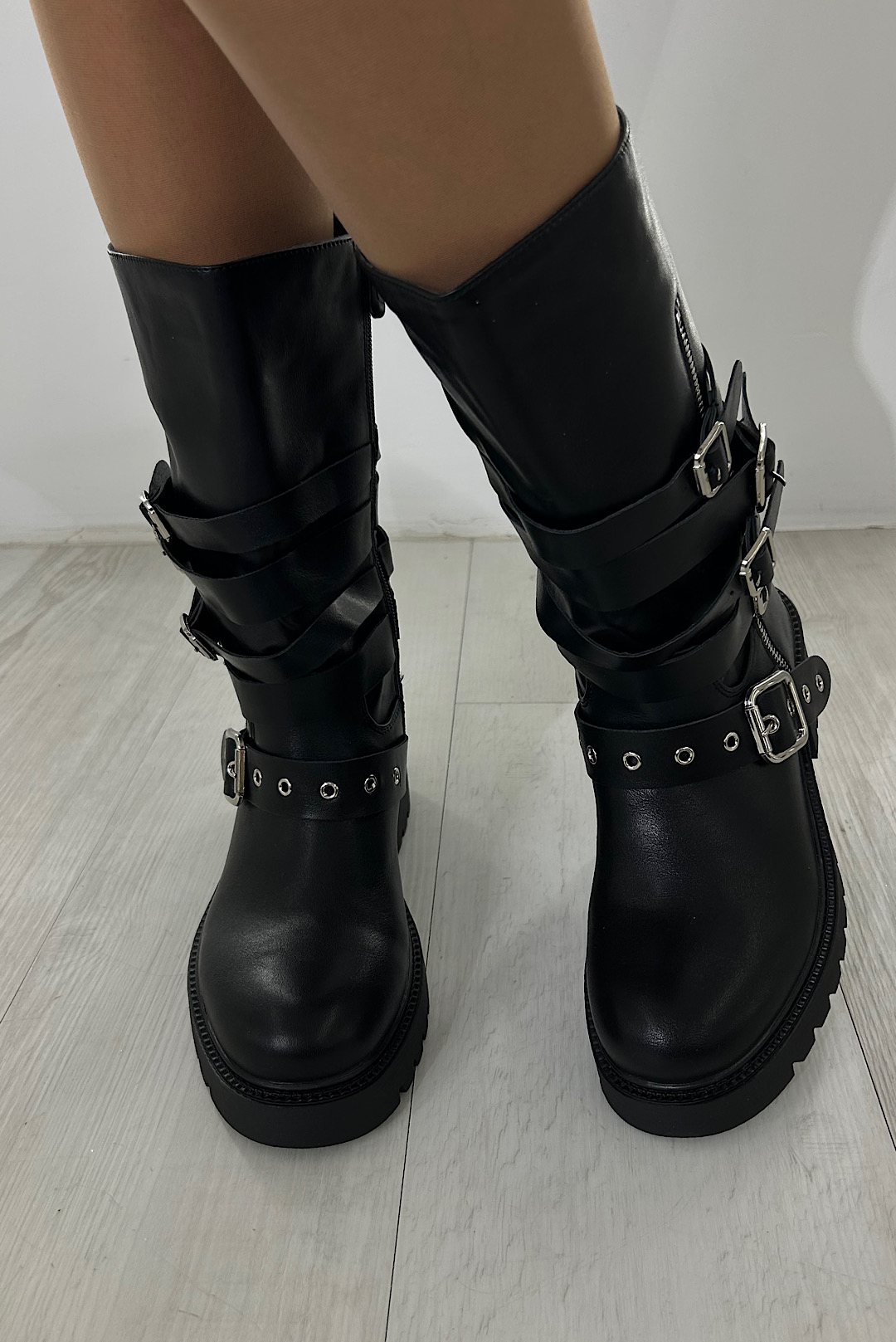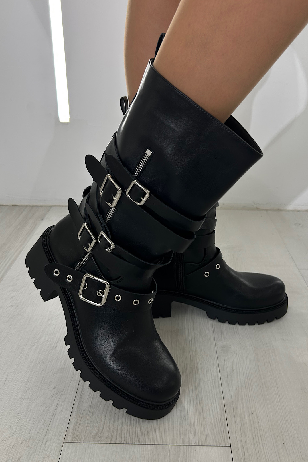 Μαύρα μποτάκια με λουράκια με ασημί αγκράφα