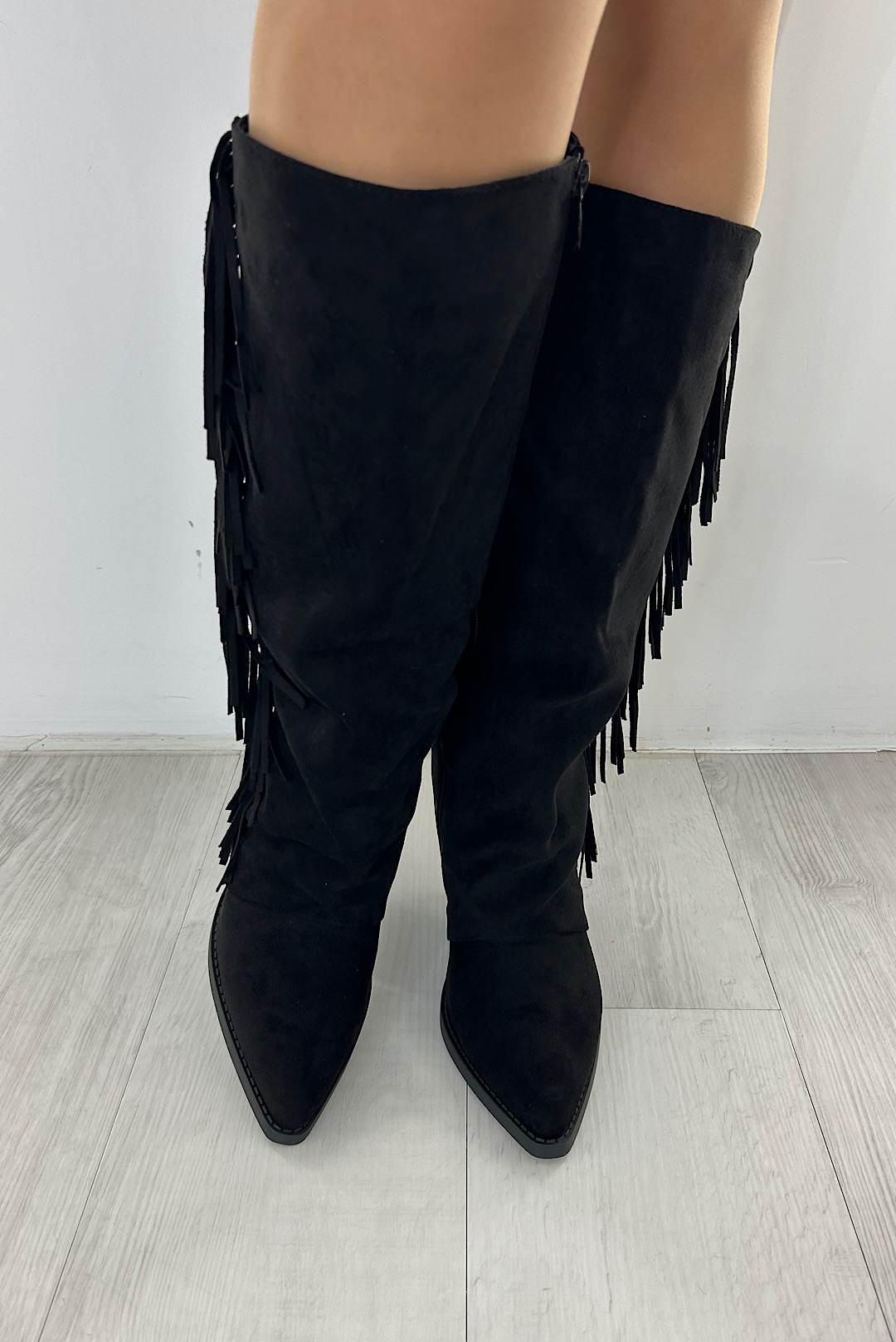 Μπότες σουέτ σε μπέζ και μαύρο χρώμα με κρόσια στην εξωτερική μεριά