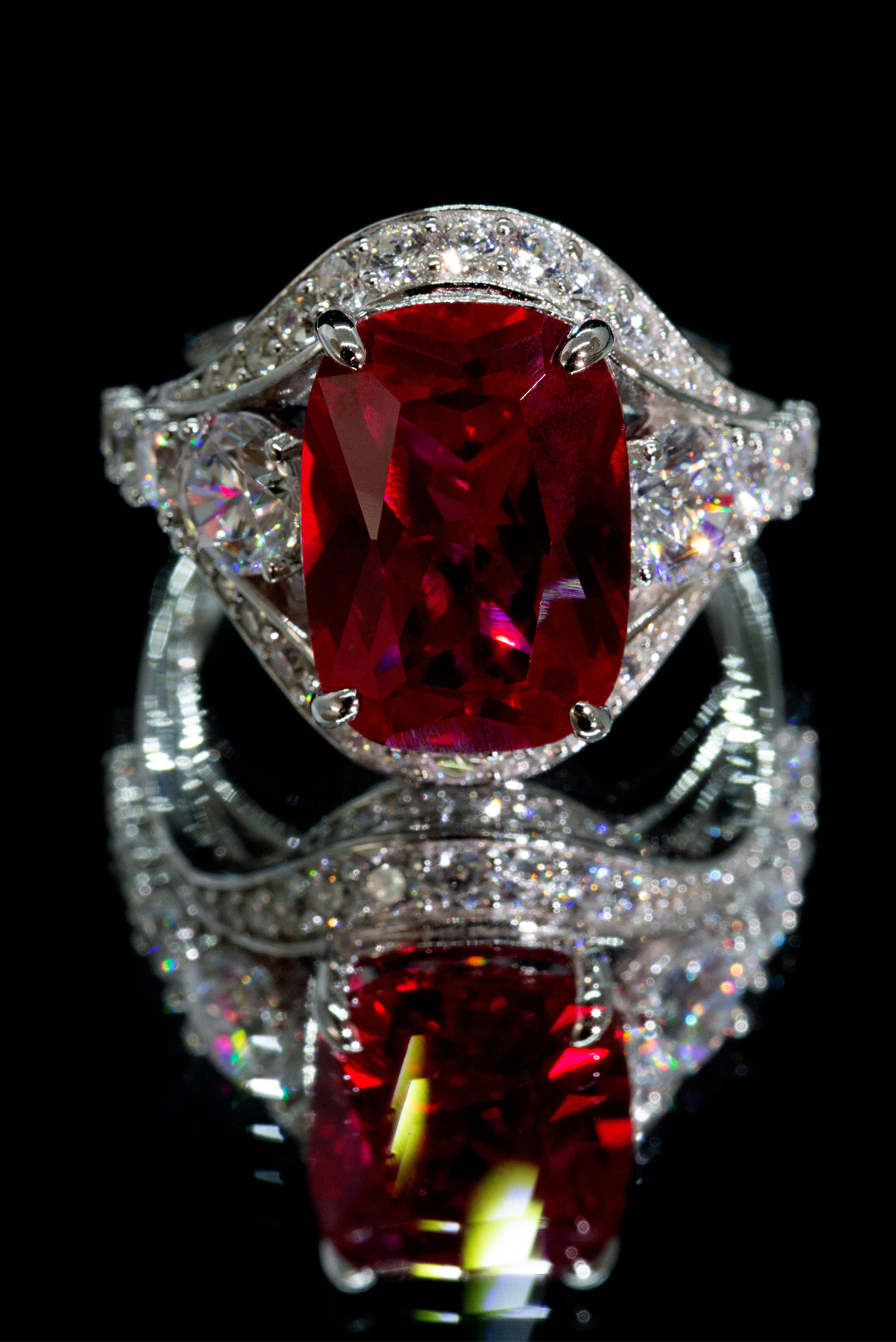 Radiant moissanite in burgandy color, with a pave design decorated with smaller colorless moissanites, and set in a 925 silver frame. GM: 7.60     Carat Weight: 3.5