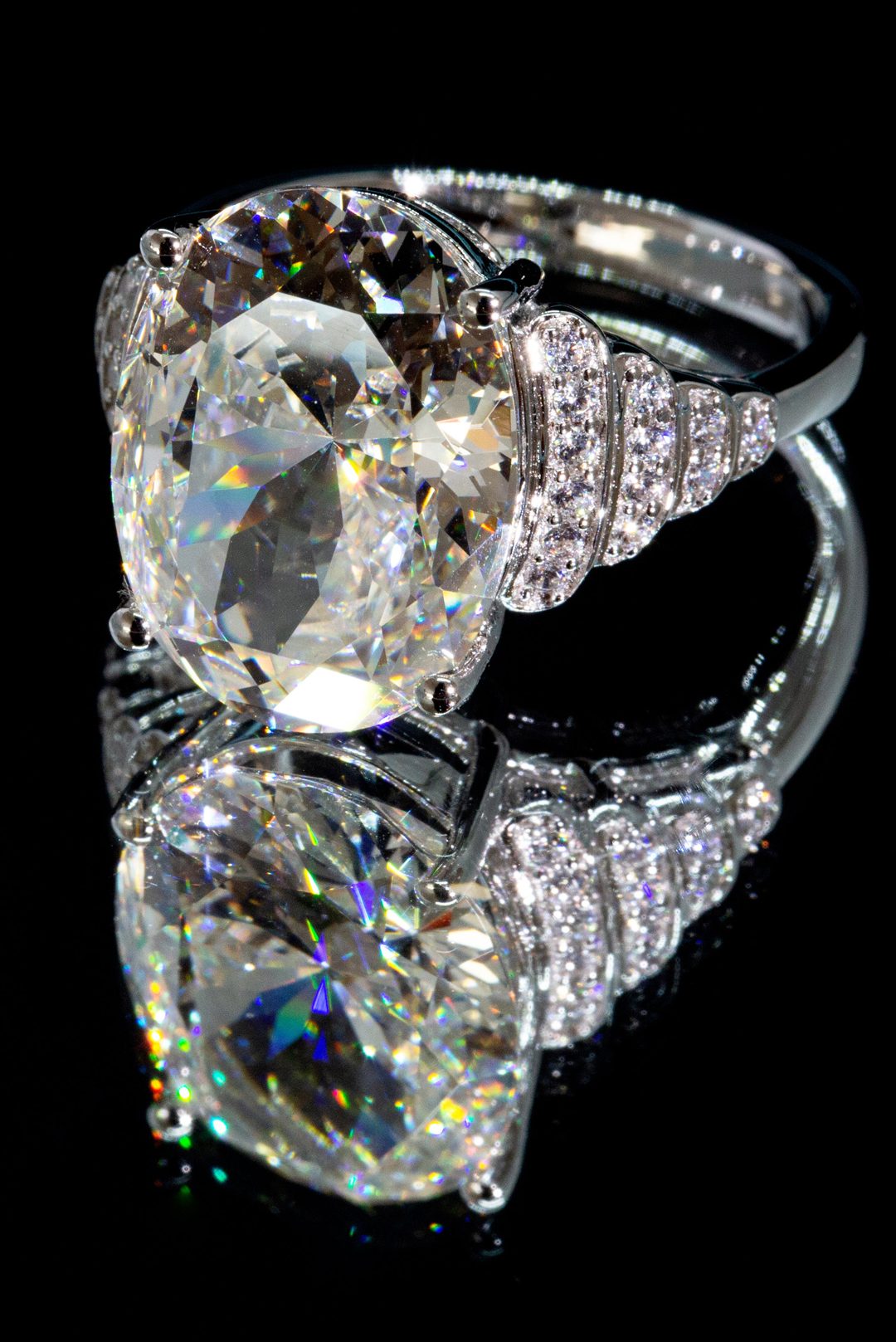 Oval colorless moissanite ring set in a 925 silver frame. GM: 6.80     Carat Weight: 5.00