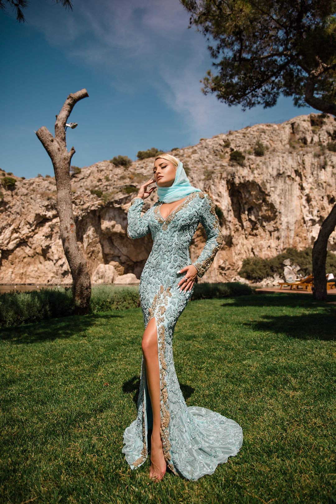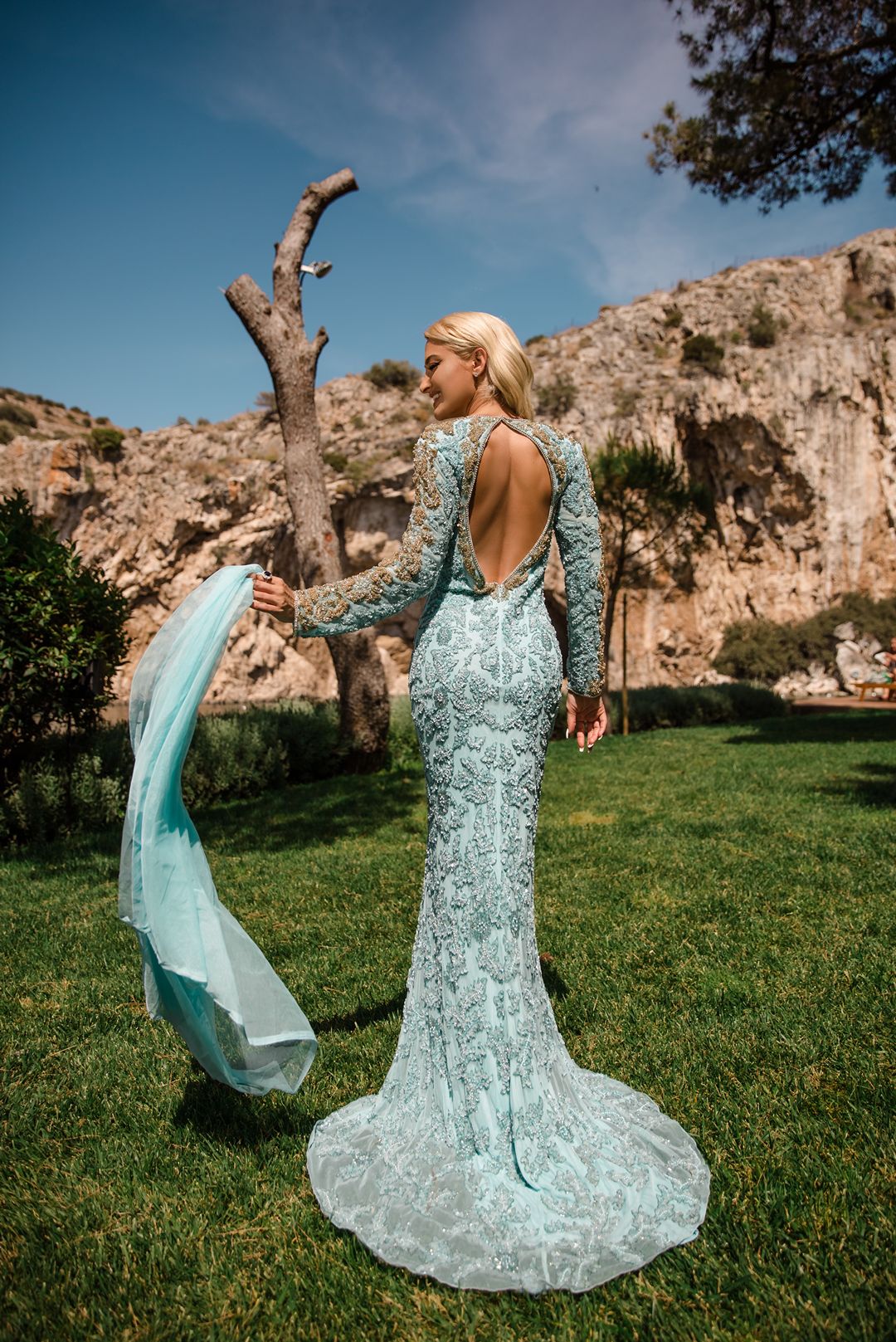 Χειροποίητο μάξι φόρεμα γοργονέ με baby blue δαντέλα, διακοσμημένο με πούλιες και χρυσές χάντρες και ανοιχτή πλάτη.