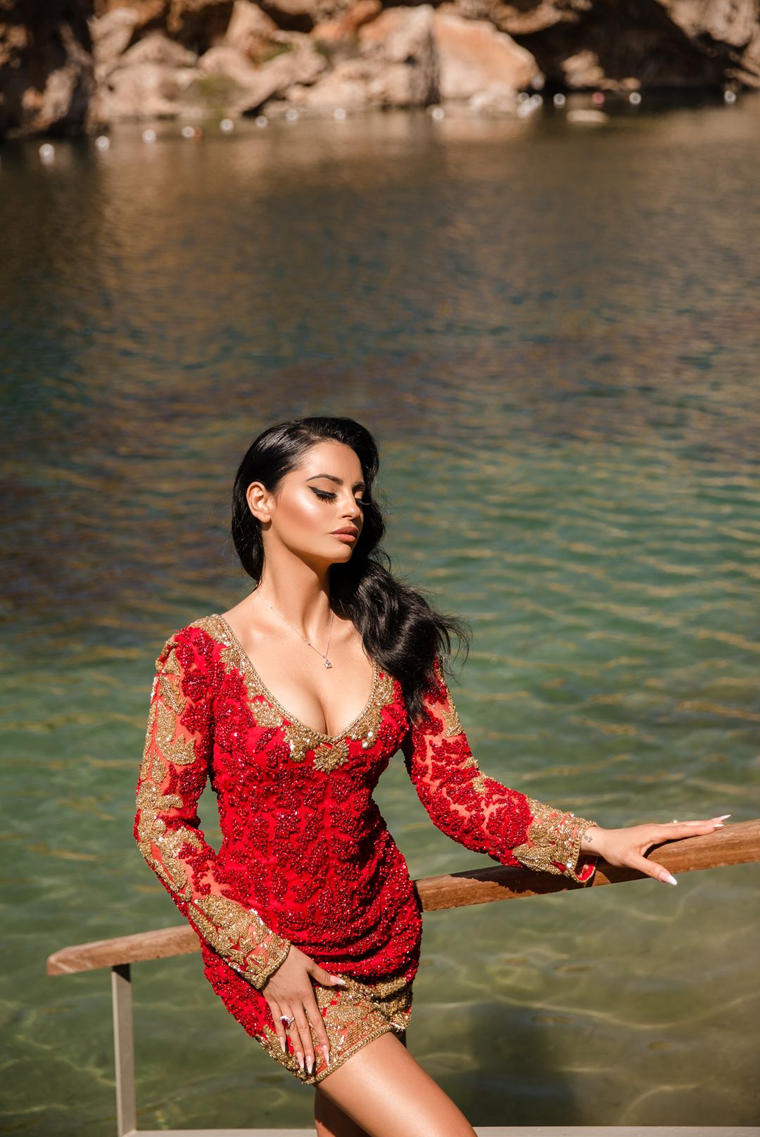 Χειροποίητο κόκκινο χρυσό μίνι φόρεμα με κόκκινη δαντέλα και παγιέτες με λαιμόκοψη και ανοιχτή πλάτη.