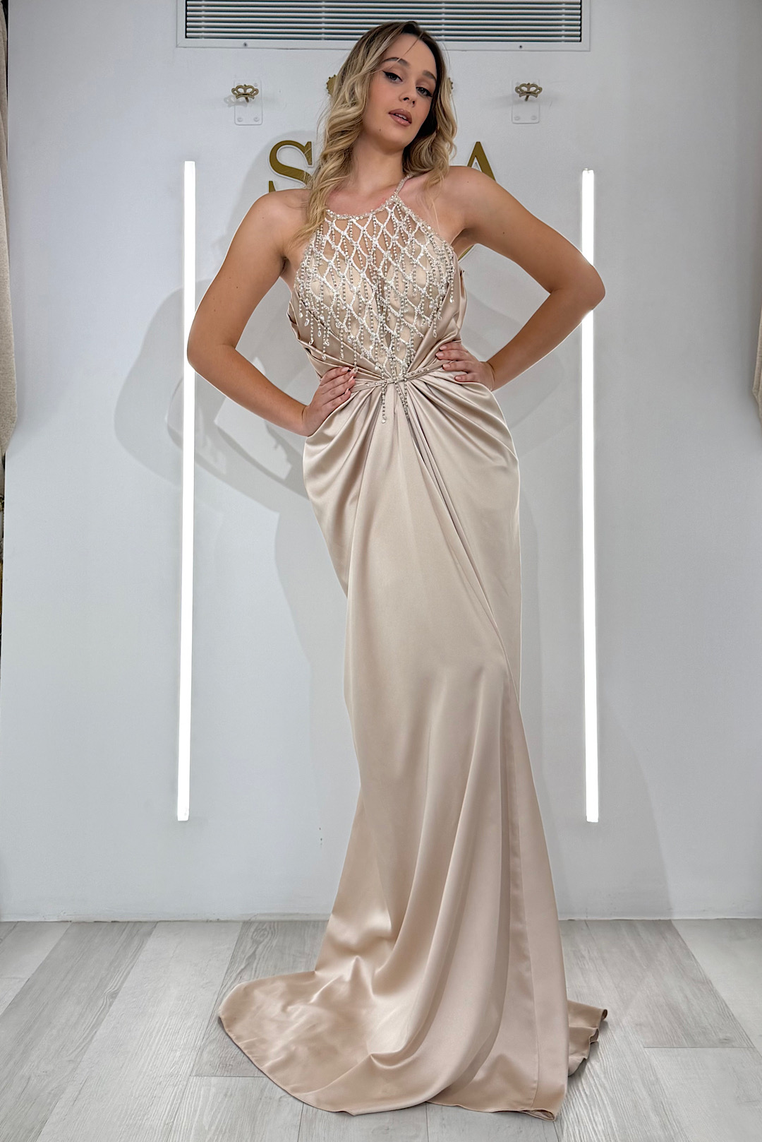 Σατέν φόρεμα σε άσπρο και μπέζ χρώμα, με κρόσια από χάντρες στο μπούστο.