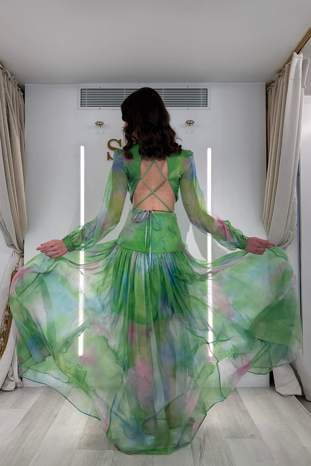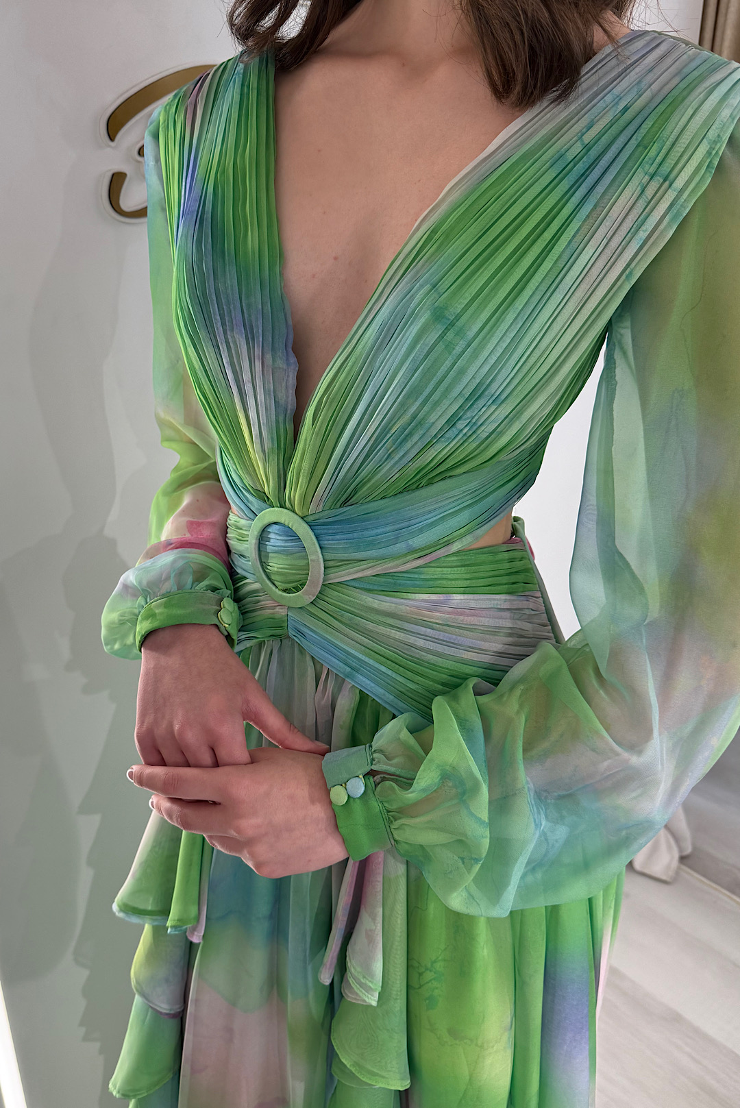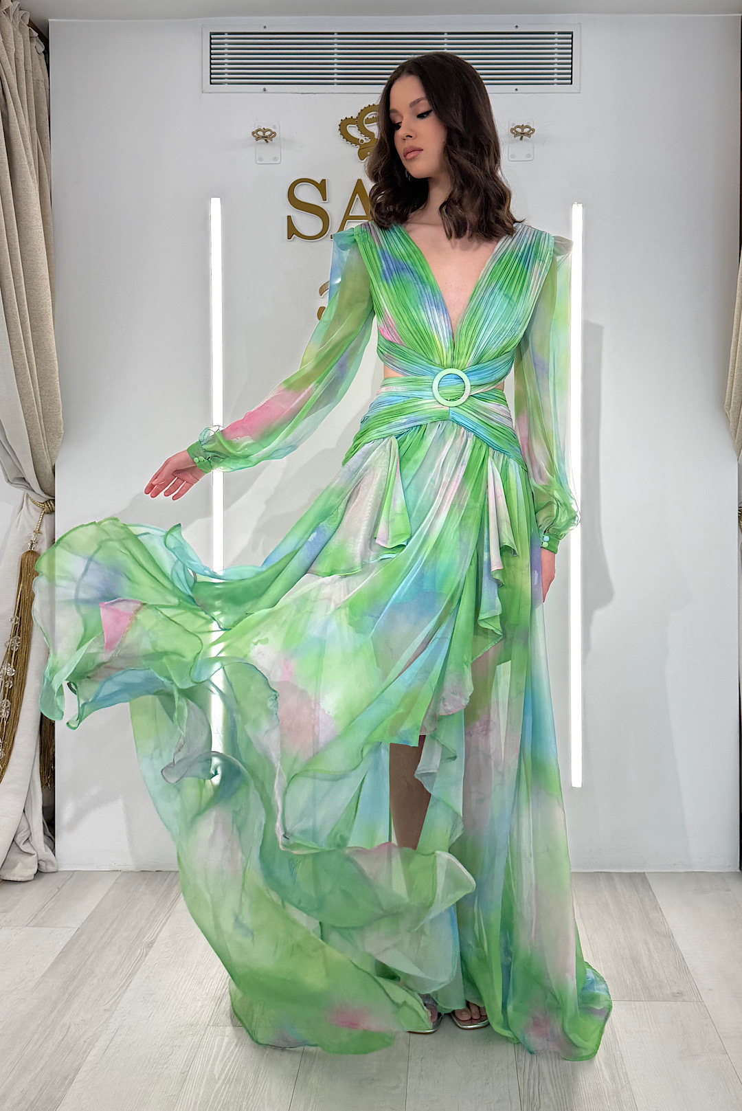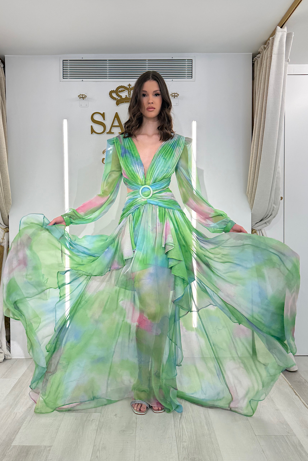 Ένα αέρινο maxi φόρεμα σε πράσινo χρώμα με ροζ αποχρώσεις ,εντυπωσιακές βάτες και κομψή αγκράφα στη μέση