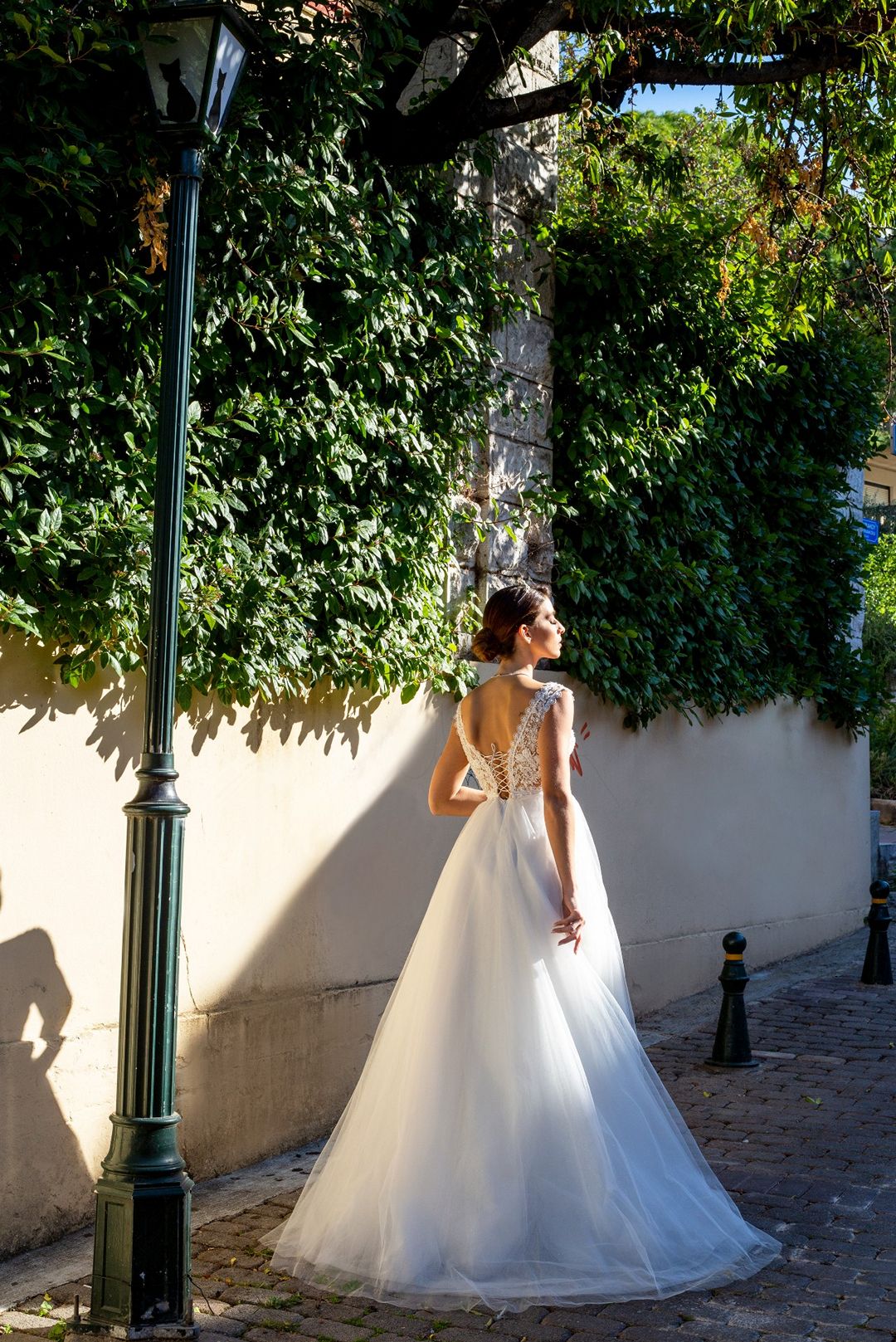 Εντυπωσιακό χειροποίητο νυφικό σε στυλ Bohemian στυλ με κορσέ και αποσπώμενο φούρο. Ο συνδυασμός της λευκής φούστας και του μπεζ κορσέ τονίζει τον γυναικείο σωματότυπο και είνα στολίζμένο κέντημα και κρύσταλλα τύπου Swarovski.