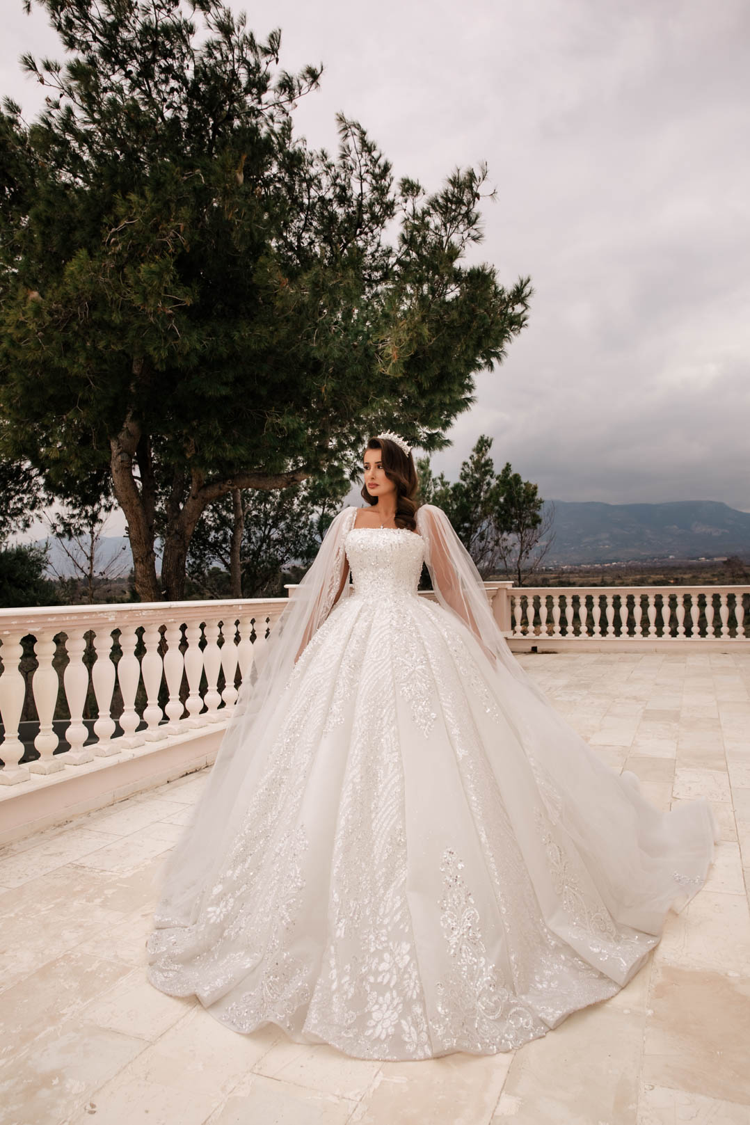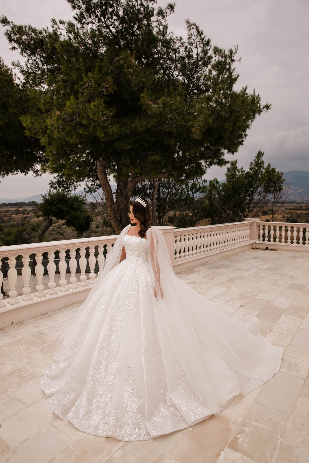 Εντυπωσιακό χειροποίητο νυφικό σε άσπρο, πριγκιπική γραμμή με κορσέ και αποσπώμενο φουρό. Το σχέδιό του κολακεύει τον γυναικείο σωματότυπο και είναι στολισμένο με πούλιες, μεταξωτό τούλι, κρύσταλλα τύπου swarofski, πέρλες και καταλήγει σε ουρά 2 μέτρων.