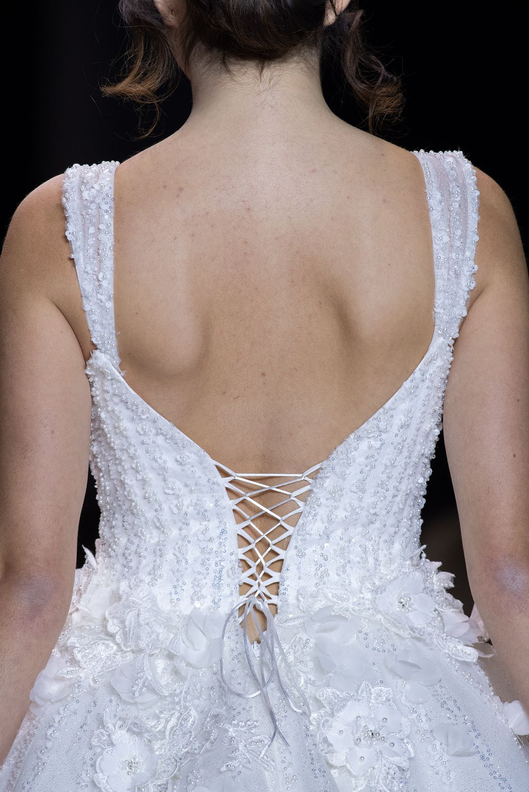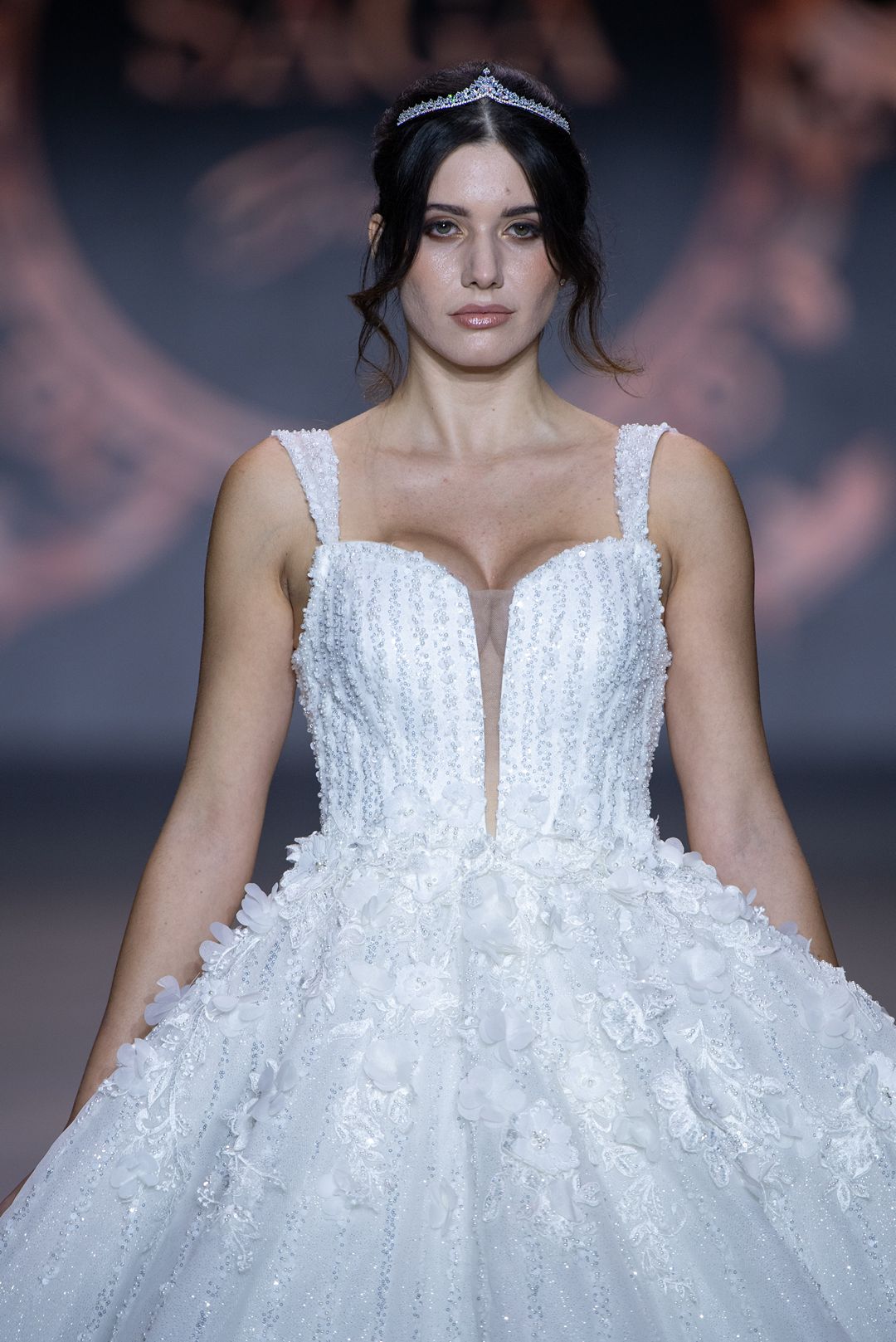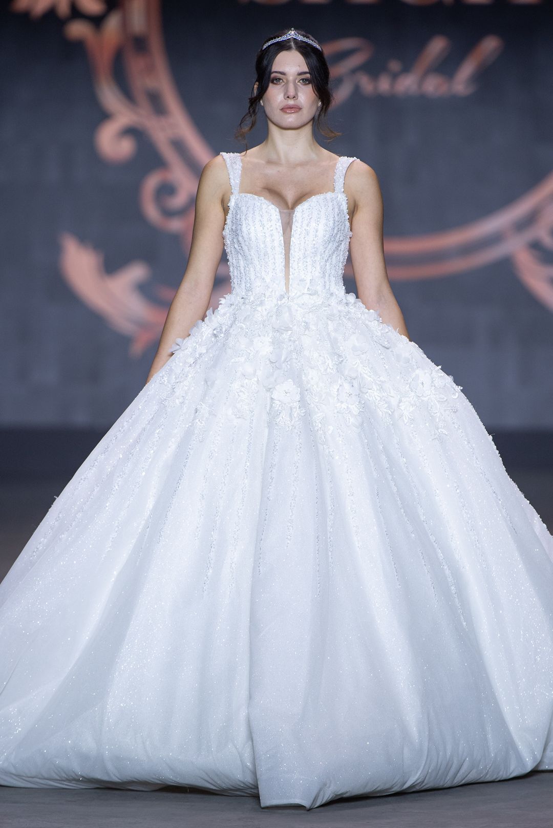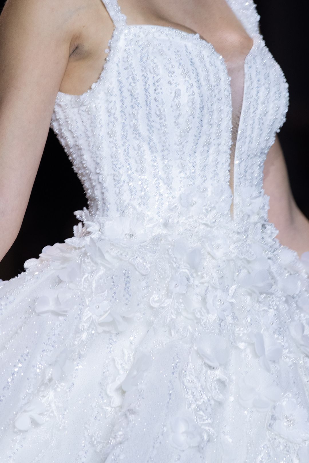 Εντυπωσιακό χειροποίητο λευκό νυφικό σε πριγκιπική γραμμή με κορσέ και φουρό. Έιναι διακοσμημένο με πέρλες γκλίτερ και καταλήγει σε ουρά 2,5 μέτρων.