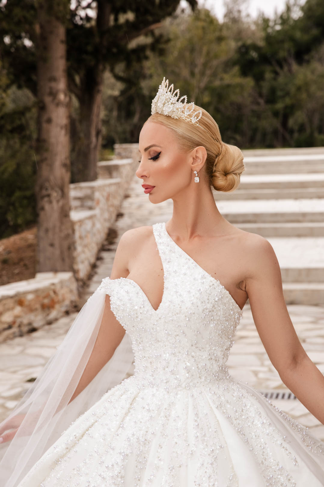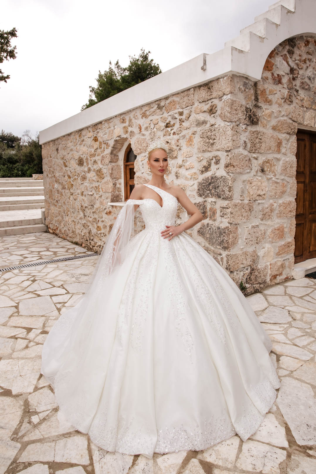 Εντυπωσιακό χειροποίητο νυφικό σε άσπρο, πριγκιπική γραμμή με κορσέ και αποσπώμενο φουρό. Το σχέδιό του κολακεύει τον γυναικείο σωματότυπο και είναι στολισμένο με πούλιες, μεταξωτό τούλι, πέρλες και καταλήγει σε ουρά 2 μέτρων.