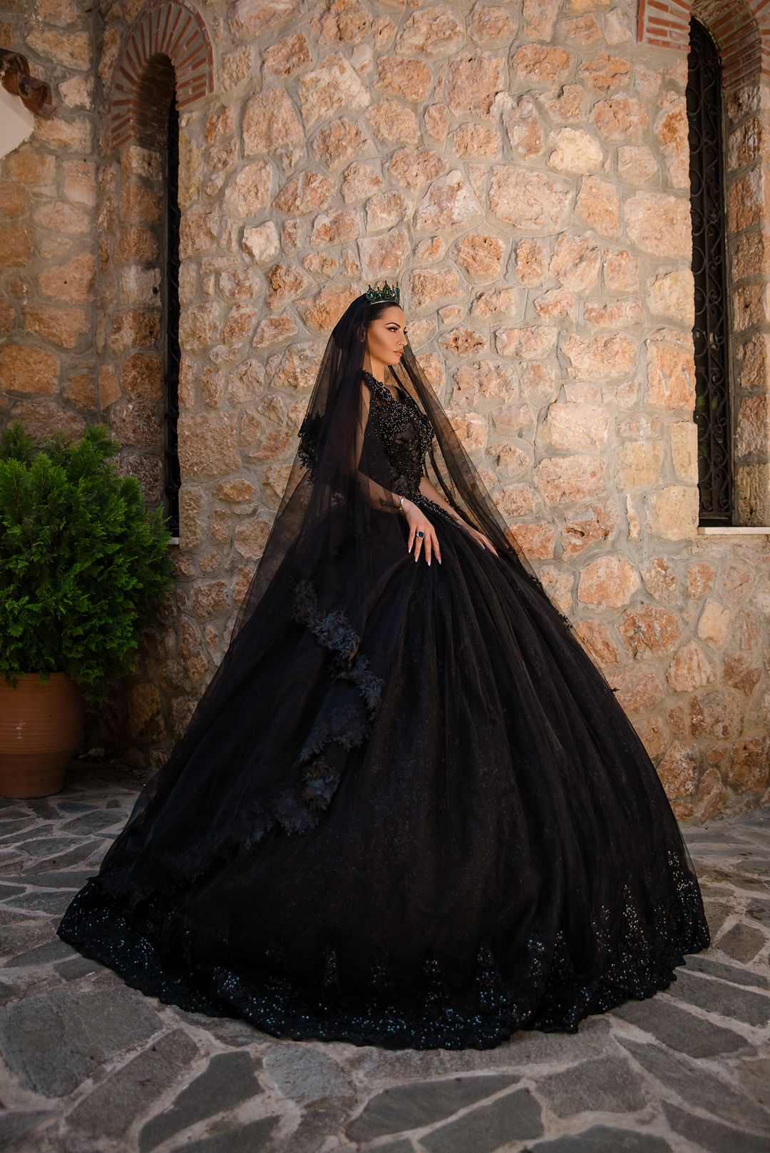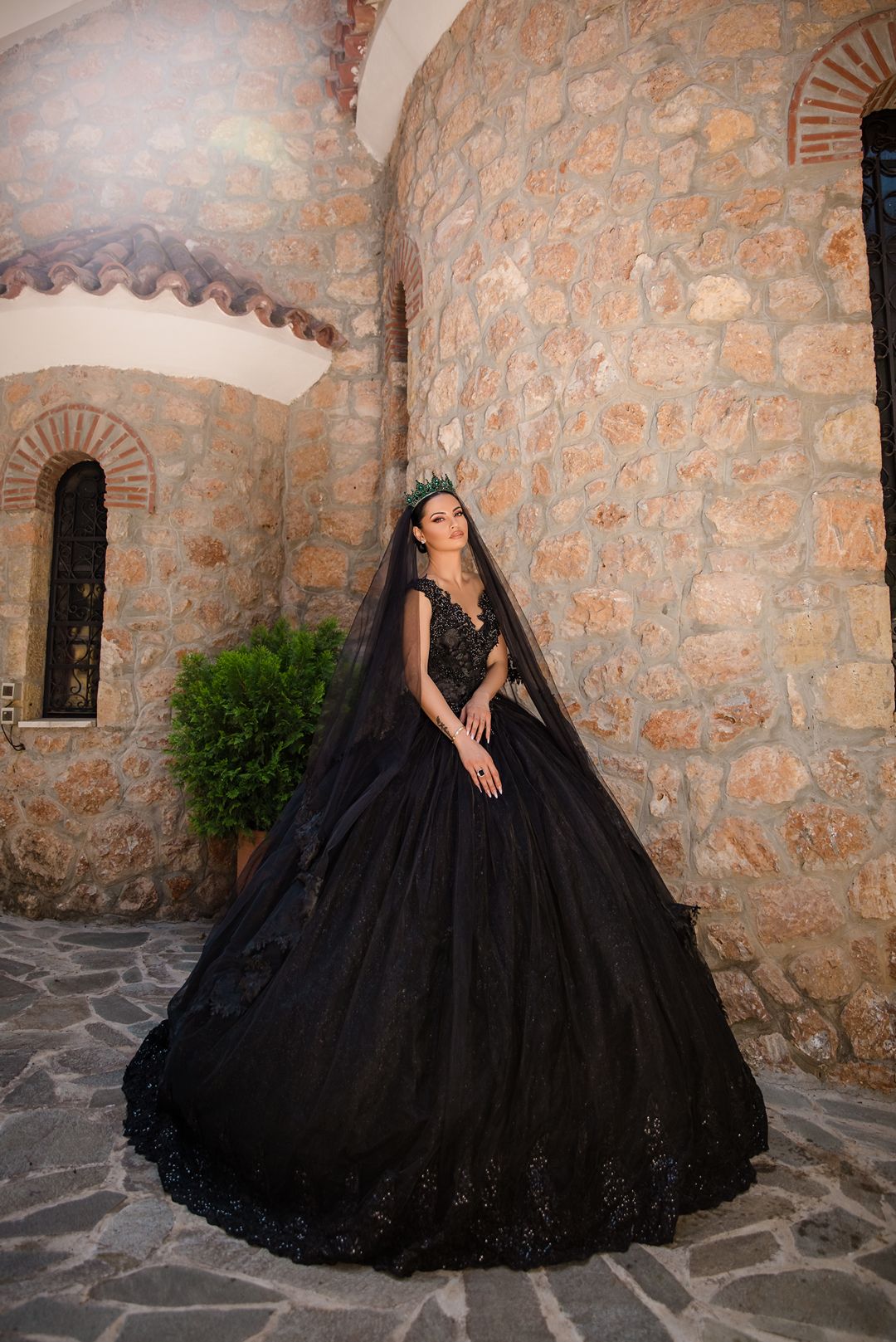 Εκπληκτικό χειροποίητο μαύρο νυφικό σε γραμμή πριγκιπική με κορσέ και αποσπώμενο φουρό. Το σχέδιό του με λεπτές κεντημένες τιράντες αναδεικνύει τον γυναικείο σωματότυπο και είναι διακοσμημένο με μεταξωτό τούλι και κρύσταλλα τύπου swarofski.
