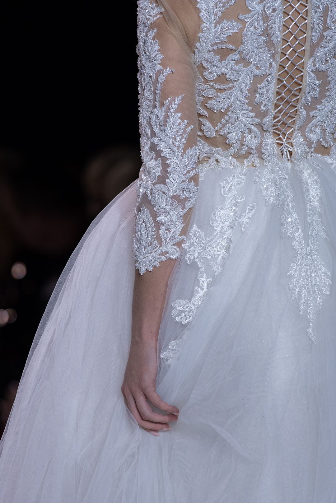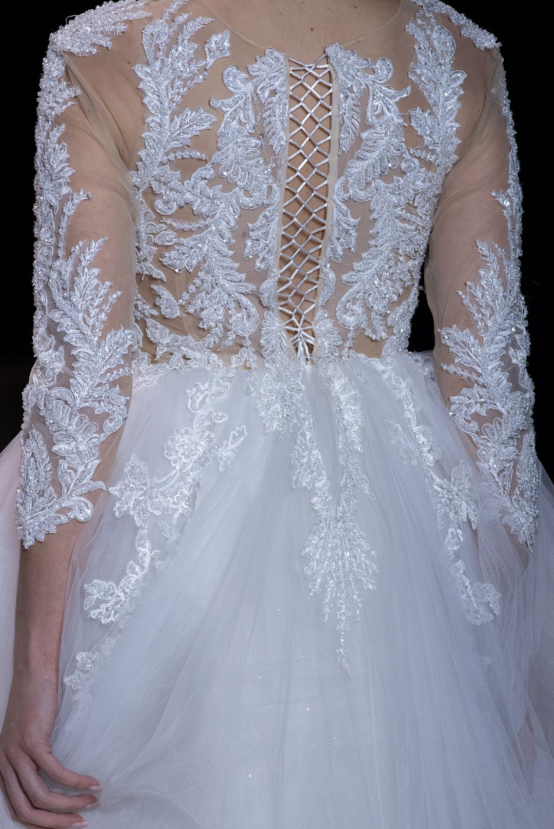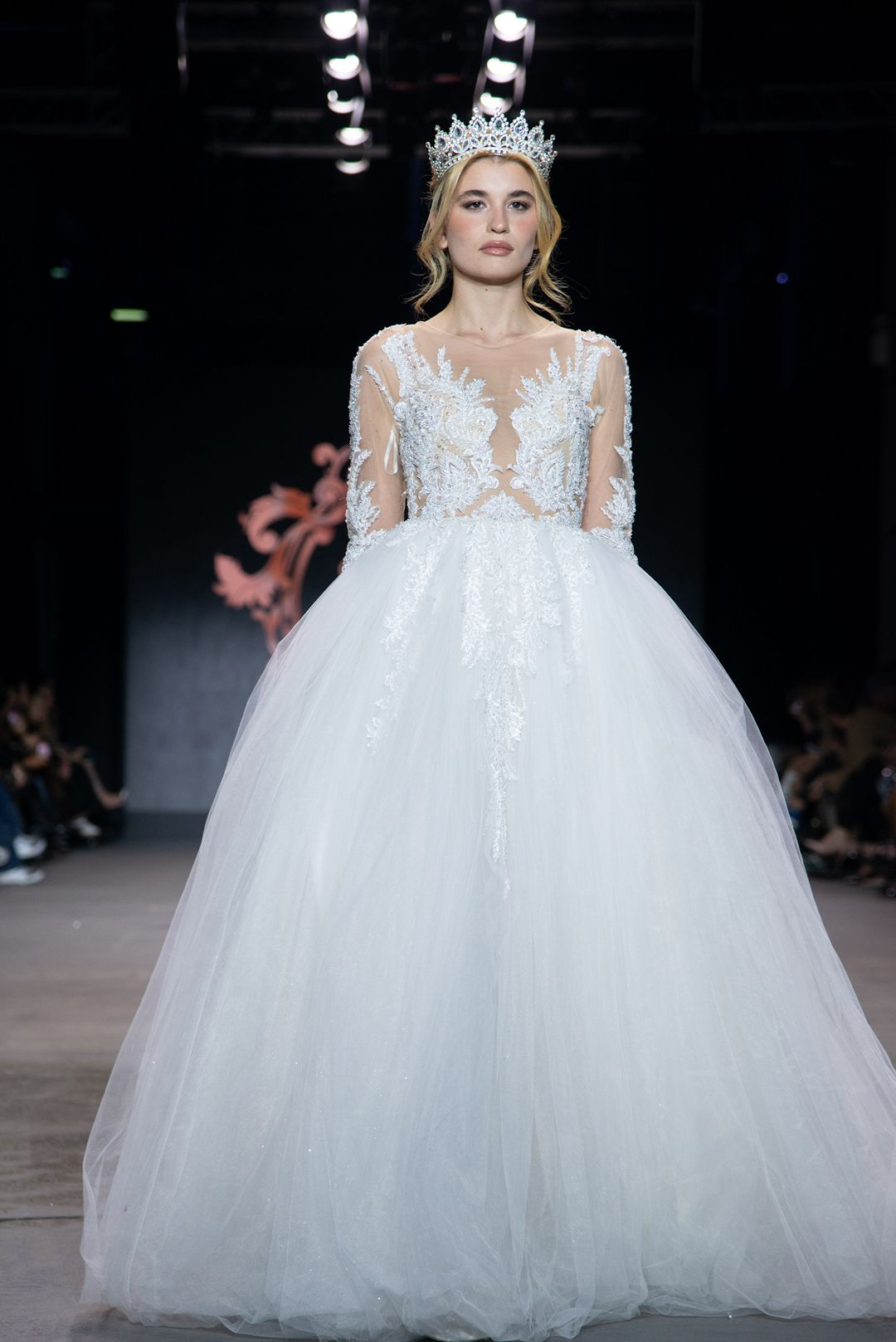 Εντυπωσιακό χειροποίητο λευκό νυφικό σε πριγκιπική γραμμή με κορσέ και φουρό.  Έιναι διακοσμημένο με πέρλες, κρυστάλους, γκλίτερ και καταλήγει σε ουρά 2,5 μέτρων.
