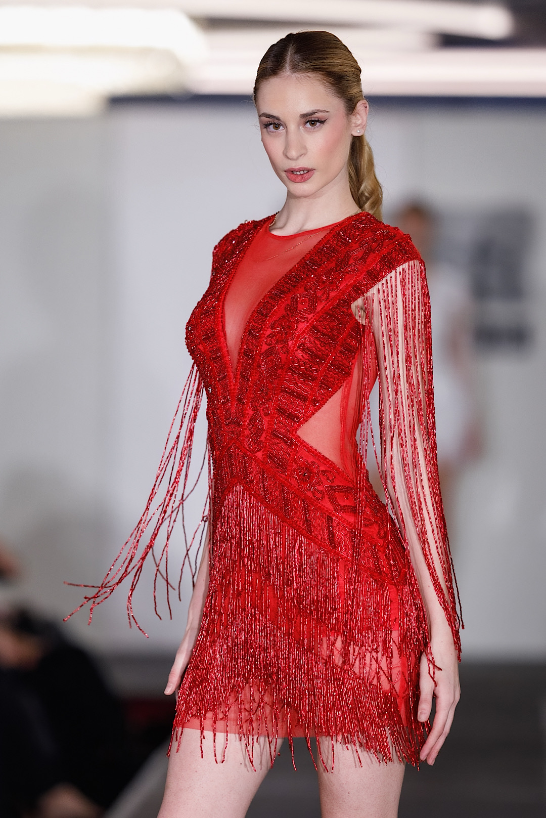 Μίνι χειροποίητο φόρεμα με κρόσσια από χάντρες στα μανίκια και δαντέλα στο μπούστο.